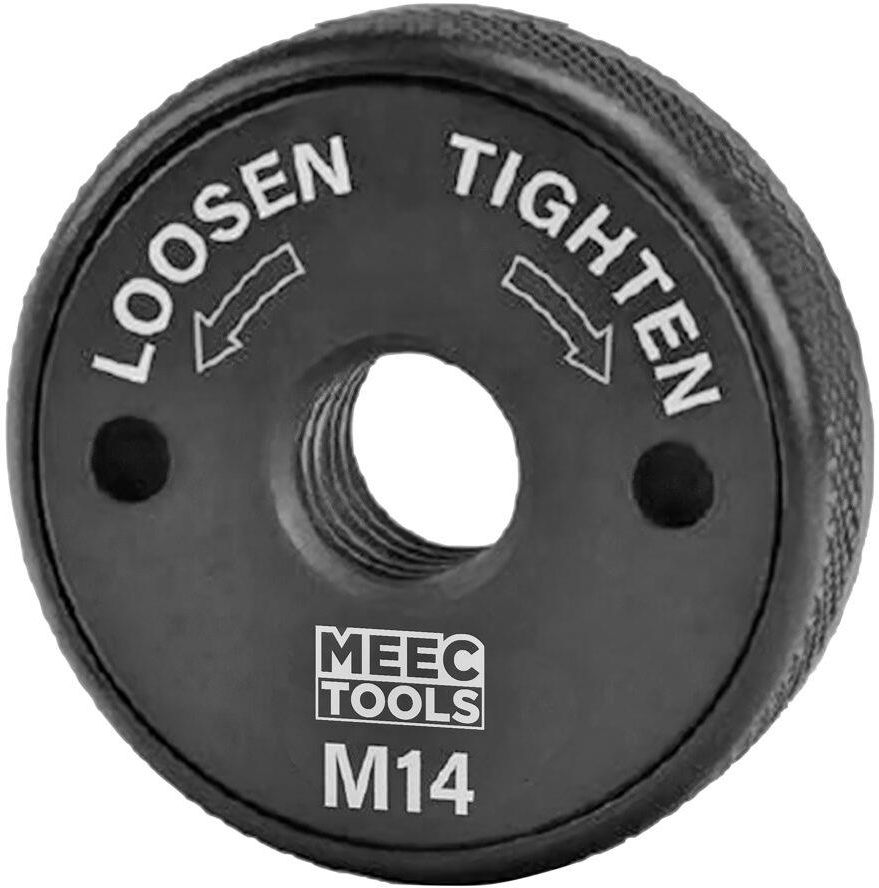 Nakrętka zabezpieczająca, którą można dokręcić ręką!Z nakrętką zabezpieczającą marki Meec Tools wymiana tarczy szlifierki kątowej będzie banalnie prosta. Tę uniwersalną nakrętkę zabezpieczającą dokręca się i odkręca ręką, co przyspiesza wymianę i ogranicza konieczność noszenia ze sobą narzędzi. Nakrętka pasuje do wszystkich szlifierek kątowych z gwintem M14.