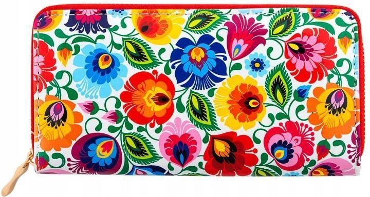 Podłużny biały portfel folk z wzorem łowickim. Wzory ludowe na portfelu przedstawiają motywy kwiatowe inspirowane wycinanką łowicką. Lakierowany, zamykany na suwak w kolorze czerwonym. Wewnątrz posiada przegródki (1 w środku na monety zapinaną na suwak, po bokach miejsce na 8 kart, 2 boczne podłużne przegródki). Zapakowany w ozdobne kartonowe pudełko. Wymiary:szerokość: 19 cmwysokość: 9,5 cmgrubość: 2,5 cm