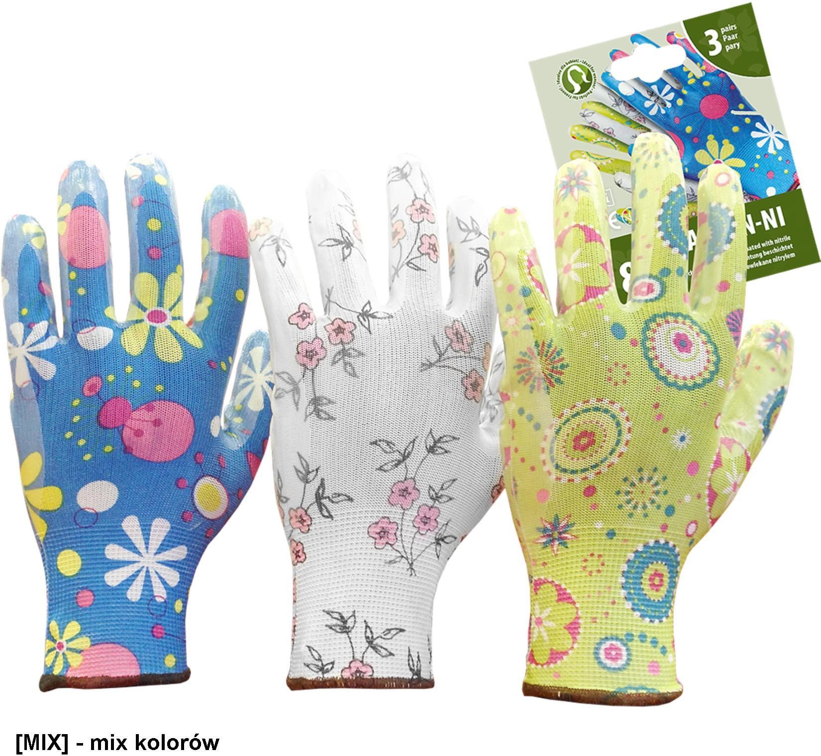 Minimalna ilość zamówienia to opakowanie zawierające 12 par (sprzedaż tylko w pełnch opakowaniach).Cena podana jest za parę rękawic. RGARDEN-NI Rękawice ochronne powlekane nitrylem. wykonane z poliestru (ścieg 13). Zakończone ściągaczem. Elastyczne, dzięki czemu świetnie dopasowują się do dłoni. Zapewniają manualność oraz doskonałe czucie trzymanego przedmiotu. Nitryl zwiększa odporność na smary i oleje. Idealne dla kobiet. Doskonale sprawdzą się w gospodarstwach domowych. W pakiecie znajdują się 3 pary o różnych kolorach i wzorach. Każdy pakiet posiada zawieszkę, dzięki czemu świetnie się prezentują i są idealne na wszelkiego rodzaju prezentacje. Marka: REIS Produkt polecany dla branż: Logistyka w tym transport i przeładunek (prace magazynowe),Rolnictwo Ogrodnictwo Leśnictwo Łowiectwo Rybactwo