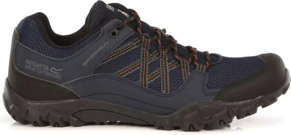 Męskie buty trekkingowe firmy REGATTA Model: RMF617 EDGEPOINT III kolor: navy/burnt umber QFD Męskie buty trekkingowe Edgepoint Mid III WP są oddychające oraz wygodne; wykonane z materiału syntetycznego. Dzięki zastosowaniu technologii Isotex i Hydropel są wodoodporne, co zapobiega przedostawaniu się wody opadowej i z kałuż. Wyściełany kołnierz i język oraz formowana wkładka EVA zapewnią komfort przez cały dzień. Dzięki oddychającemu materiałowi stopy pozostają świeże podczas długich wędrówek. Lekka i trwała podeszwa zewnętrzna z tworzywa TPR zapewnia długotrwałą odporność na ślizganie. Obuwie idealne na nierówny teren lub spacery na łonie natury. SZCZEGÓŁY PRODUKTU cholewka: materiał syntetyczny, siatka; 52% poliuretan, 48% poliester technologia Hydropel technologia Isotex gumowa osłona palców i pięty wyprofilowana, wygodna wkładka EVA
