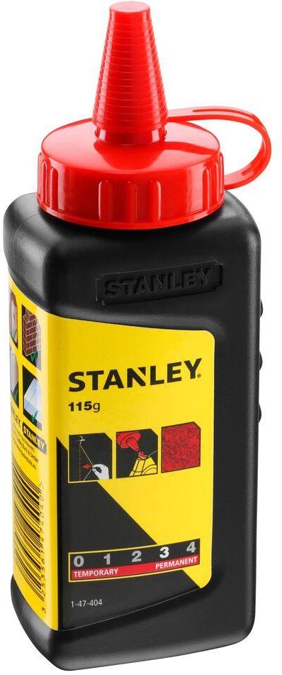 Kreda traserska czerwona 115g Stanley [1-47-404] wodoodporna, czerwona kreda do użytku we wnętrzach, specjalny skład kredy zapewnia doskonałą przyczepność i widoczność, w poręcznej, plastikowej butelce z zamocowaną zatyczką, kształt butelki zapobiega jej stoczeniu się z powierzchni roboczej, stożkowy dozownik ułatwia uzupełnianie kredy w pojemniku ze sznurem traserskim, pojemność: 115g,