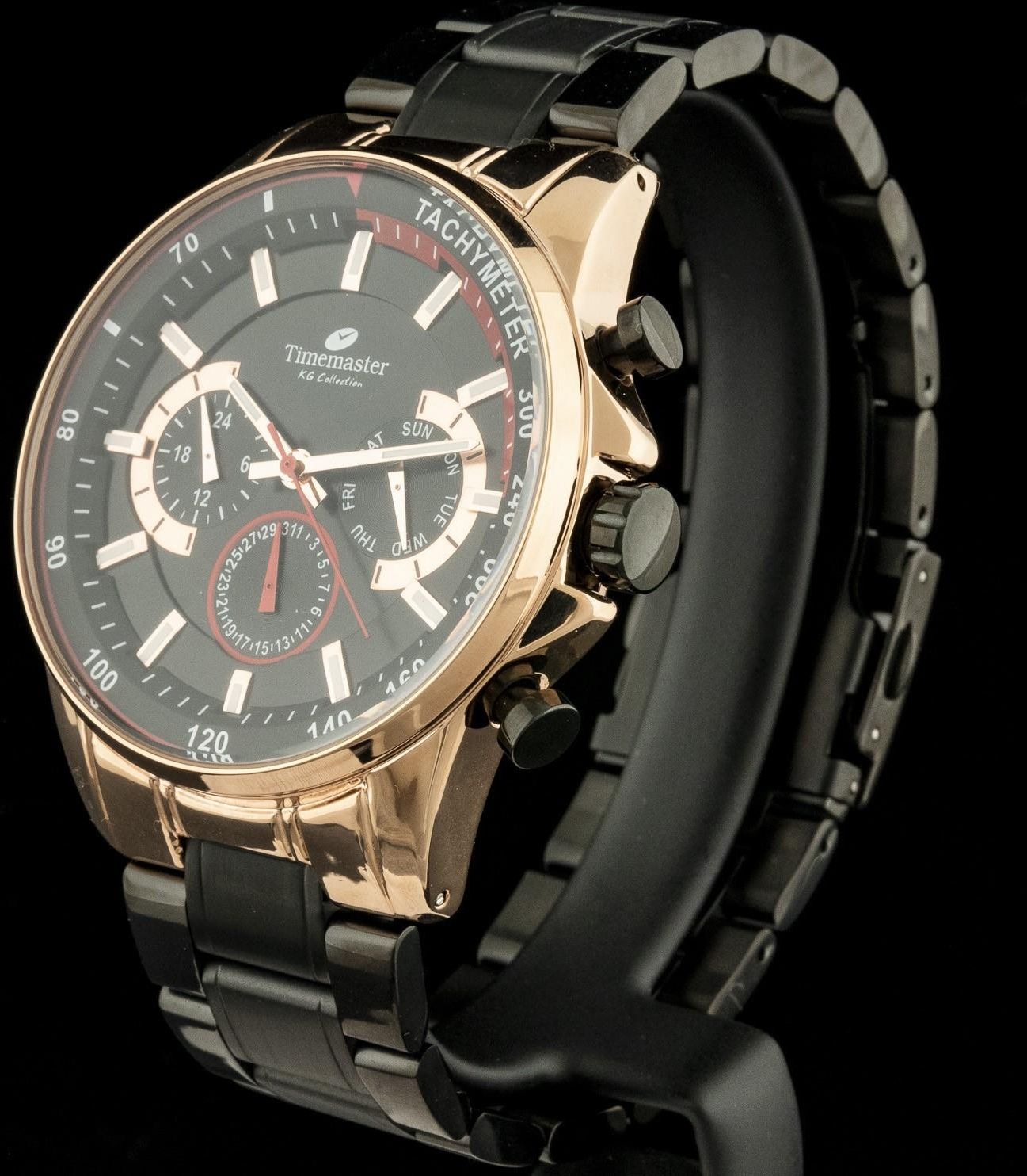 Duży, rzucający się w oczy zegarek męski. Solidna metalowa bransoleta i masywna koperta w do wybory w kolorze czerwonego złota, srebrnej lub czarnej. Ciężko przejść obojętnie obok tej serii. Czasomierz wyposażony w zegar dwudziestoczterogodzinny oraz datownik pokazujący dzień tygodnia i dzień miesiąca.