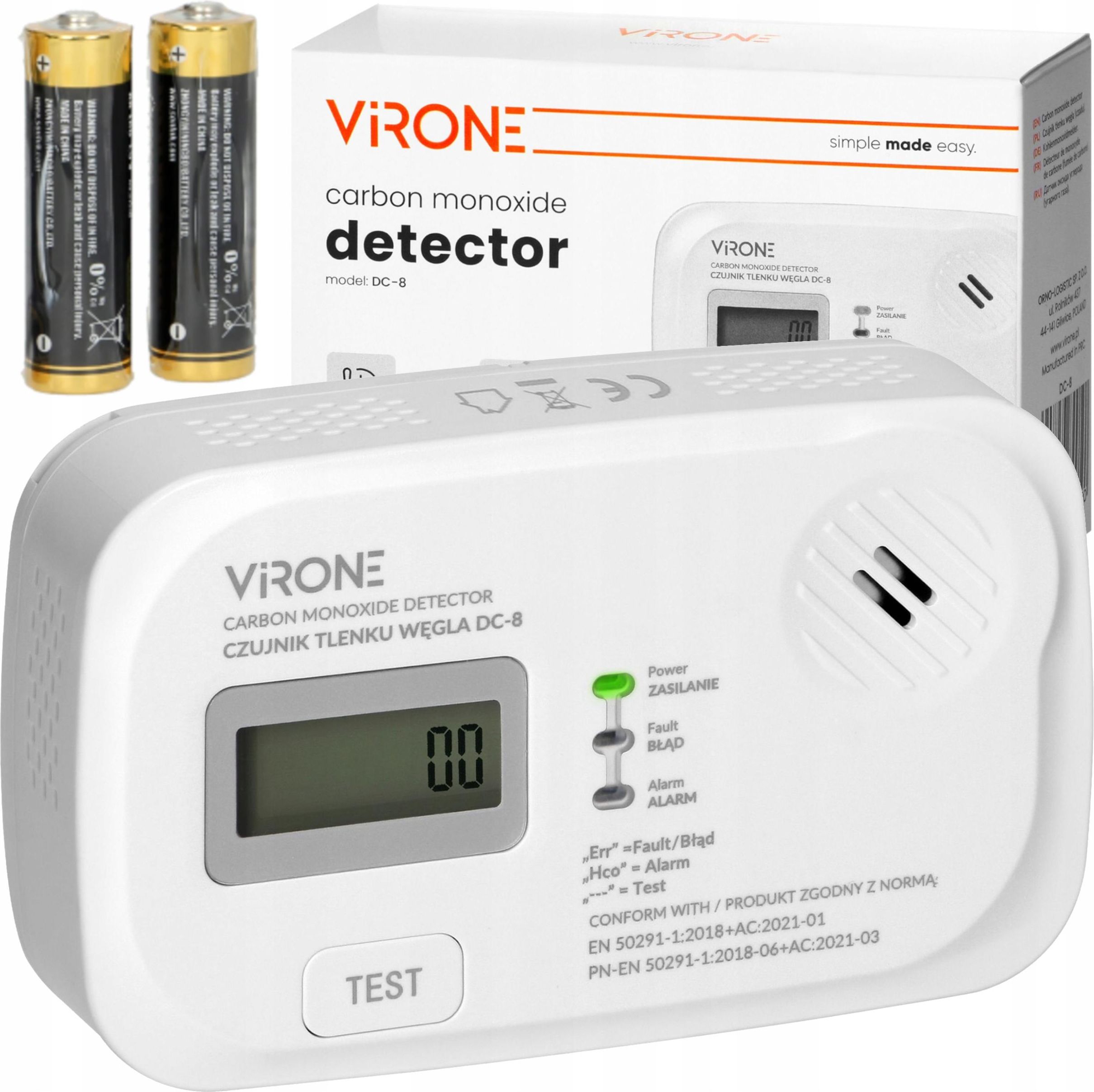 Czujnik Czadu Detektor Tlenku Węgla Czujka Bezprzewodowy 85dB CERTYFIKOWANY MODEL: VIRONE DC-8 ŻYWOTNOŚĆ CZUJNIKA 10 LAT! ⭐ ŚWIEŻA PARTIA - DATA PRODUKCJI 03/2025 Zestaw zawiera Czujnik czadu DC-8 - 1 szt. Baterie AA LR6 - 2 szt. Instrukcja obsługi w języku polskim TOWAR NOWY, ZAPAKOWANY W ORYGINALNE OPAKOWANIE KARTA GWARANCYJNA Czujnik zgodny z normą EN 50291-1:2018+AC:2021-01 dla domowych detektorów tlenku węgla W przeciwieństwie do produktów konkurencji, czujnik czadu VIRONE DC-6 jest zgodny z rygorystyczną normą EN 50291-1:2018+AC:2021 dla domowych detektorów tlenku węgla, potwierdzoną przed jednostkę certyfikującą BSI. Spokój i bezpieczeństwo w Twoim domu Czujnik czadu służy do ciągłego monitorowania obecności tlenku węgla w powietrzu oraz wykrywania i alarmowania o przekroczeniu bezpiecznego stężenia tego gazu. Żywotność sensora: aż 10 lat! Głośny alarm oraz sygnalizacja optyczna Po wykryciu niebezpiecznego stężenia tlenku węgla w powietrzu urządzenie generuje głośny alarm akustyczny (85 dB) i optyczny oraz wyświetla stężenie na ekranie LCD. Funkcja pomiaru stężenia tlenku węgla w zakresie od 10 ppm do 555ppm. Przycisk TEST - pozwala sprawdzić poprawność działania czujnika Po naciśnięciu przycisku TEST wszystkie diody LED migną raz. W przypadku poprawnej pracy czujnika, urządzenie uruchomi jeden cykl alarmowy (5 x miganie diody ALARM + sygnał dźwiękowy). Pamiętaj, aby testować urządzenie regularnie raz w miesiącu! Parametry techniczne Sygnalizacja niskiego stanu baterii: tak Przycisk TEST: tak Żywotność sensora: 10 lat Spełniane normy: PN-EN 50291-1:2018-06+AC:2021-03, EN 50291-1:2018+AC:2021-01 Zasilanie: 2x baterie AA LR6 1,5V (3V DC) Poziom głośności: >85 dB na 3m Dokładność wyświetlacza: 10-550 ppm Wyjście z trybu alarmu: <40ppm Typ sensora: elektrochemiczny Wyświetlacz: tak Wymiary: 120 x 74 x 31 mm (szer./wys./gł.) Opis budowy czujnika 1 - Wyświetlacz LCD 2 - Przycisk TEST 3 - Głośnik/buzzer 4 - Diody sygnalizujące: power (zasilanie), fault (błąd), alarm Zasilanie bateryjne z sygnalizacją słabych baterii Czujnik zasilany jest dwiema bateriami AA (w zestawie) i sygnalizuje ich niski poziom. Zasilanie bateryjne pozwala na montaż w dowolnym miejscu i działa nawet przy braku zasilania sieciowego. Czym jest tlenek węgla (czad) i dlaczego jest tak niebezpieczny? Tlenek węgla (CO) to bezbarwny, bezwonny i silnie trujący gaz, który utrudnia transport tlenu we krwi, prowadząc do niedotlenienia serca i mózgu. Powstaje przy niecałkowitym spalaniu paliw (np. gazu, benzyny, węgla). Jego emisja może wystąpić w każdej instalacji spalającej paliwa, a szkodliwość zależy od czasu narażenia na jego działanie. Urządzenia będące źródłem tlenku węgla kocioł na paliwo ciekłe lub gazowe (olej opałowy, gaz propan-butan, gaz ziemny itp.) kocioł na paliwo stałe (drewno, węgiel, koks, torf itp.) gazowy podgrzewacz wody (np. piecyk łazienkowy) kominek przenośny piecyk gazowy, piec kaflowy, kuchenka gazowa itp. Gdzie stosować czujnika czadu? W pomieszczeniach z urządzeniami spalającymi paliwo. W sypialniach, na korytarzach i tam, gdzie często przebywają domownicy. Na wysokości wzroku (150–200 cm), co najmniej 15 cm od sufitu. Minimum 150 cm od źródeł emisji. Chroń swoją rodzinę kupując detektory, które gwarantują że Ty i Twoja rodzina jesteście bezpieczni