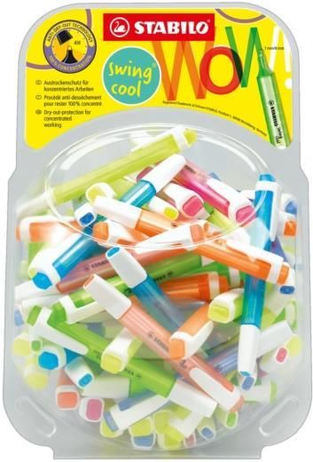 STABILO swing cool - zakreślacz dla dzieci, młodzieży i osób które podróżują. Kieszonkowy format zakreślacza z praktycznym klipsem do zaczepiania sprawia, że nie zajmuje dużo miejsca więc można go zawsze mieć przy sobie (w torbie, piórniku, kieszeni). Technologia Anti-Dry-Out sprawia, że pozostawiony bez skuwki nawet prze 4 godziny nie zasycha. Grubość linii 1-4 mm. Dostępny w 8 kolorach. Plastikowy display w kształcie kuli zawierający 100 szt. w 7 kolorach. Wymiary displaya 190x190x235 mm.