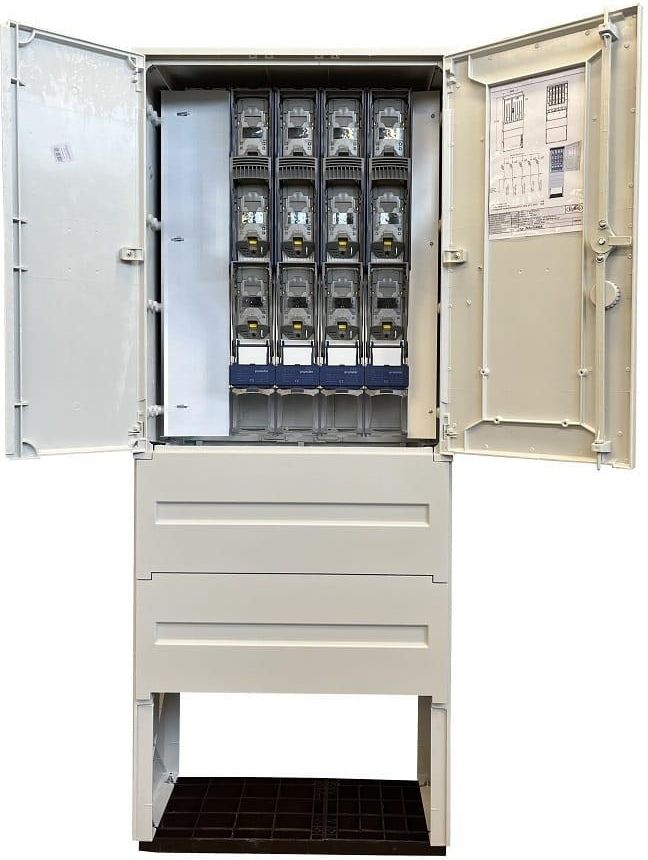Złącze kablowe ZK4b-5x400A służy do rozdziału i zabezpieczenia przed skutkami zwarć i przeciążeń obwodów zasilanych z sieci elektroenergetycznej prądu przemiennego. Parametry techniczne: wymiary: szer. x wys. gł. 660x1773x320 (mm) rozdzielnica na fundamencie do wkopania w ziemię, drzwi z zamkiem oraz wkładką na klucz 1333, 4 x rozłącznik bezpiecznikowy listwowy 400A z zaciskami VKlema 240mm2 3x VK240mm2 na kabel zasilający szyna PEN z zaciskami VKlema 240mm2 DOKUMENTACJA DO POBRANIA: