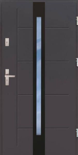 Drzwi wejściowe z kolekcji LIBERTO wyróżnia tłoczona powierzchnia skrzydła oraz panel dekoracyjny ze szczotkowanego aluminium anodowanego na czarno.