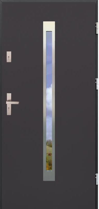 Kolekcja drzwi wejściowych OTELLO obejmuje drzwi z gładkim skrzydłem, które w modelach z przeszkleniem dekoruje panel ze stali nierdzewnej w kolorze INOX bądź ramka PCV.