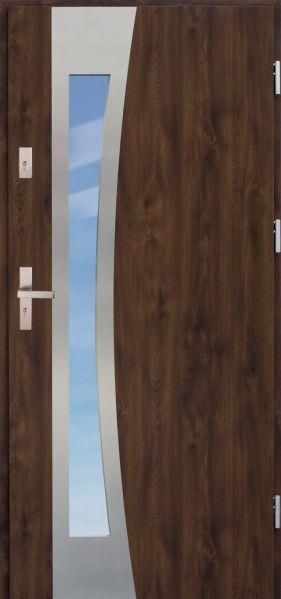Kolekcja drzwi wejściowych OTELLO obejmuje drzwi z gładkim skrzydłem, które w modelach z przeszkleniem dekoruje panel ze stali nierdzewnej w kolorze INOX bądź ramka PCV.