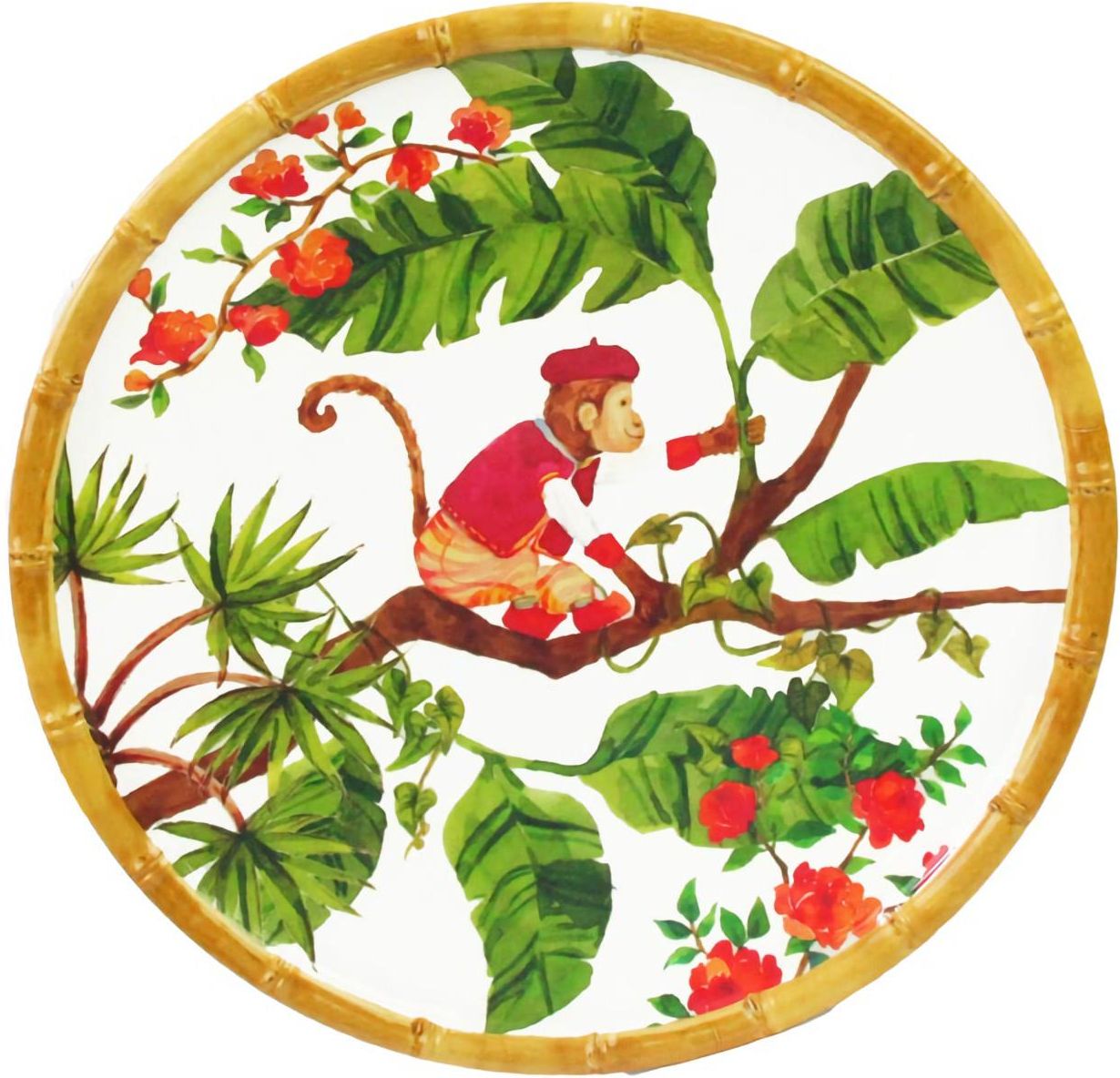 Nieduży, unikalny talerz płaski o średnicy 23 cm z kolekcji Monkeys of Bali. Wykonany z trwałej melaminy. Ozdobiony wzorem z tropikalnymi roślinami i małpkami.