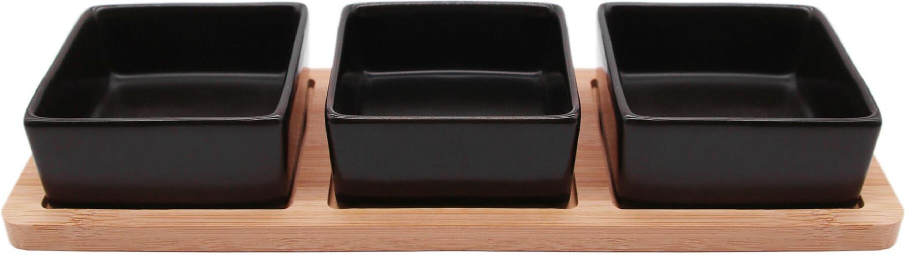 Podaj gościom drobne przekąski i dipy w eleganckich czarnych miseczkach. Każde naczynie ma 165 ml pojemności – nadadzą się na sosy do mięs lub pizzy. Zestaw 3 misek na bambusowej podstawie przydadzą na różne przyjęcia – na spotkanie dla znajomych czy uroczyste przyjęcie dla rodziny. Skorzystasz z nich niejeden raz. Każdy wygodnie sobie sięgnie po wybrany dodatek. Pasują do loftowego wnętrza. Wymiary podstawy: 28x9,5 cm. Grubość podstawy: 1 cm. Wymiary miski: 8x8x3,5 cm. Kwadratowe miski wygodnie przechowasz w kuchennej szufladzie. Bambusowa podstawa posiada specjalne wgłębienia, dzięki którym naczynia stabilnie trzymają się miejsca .