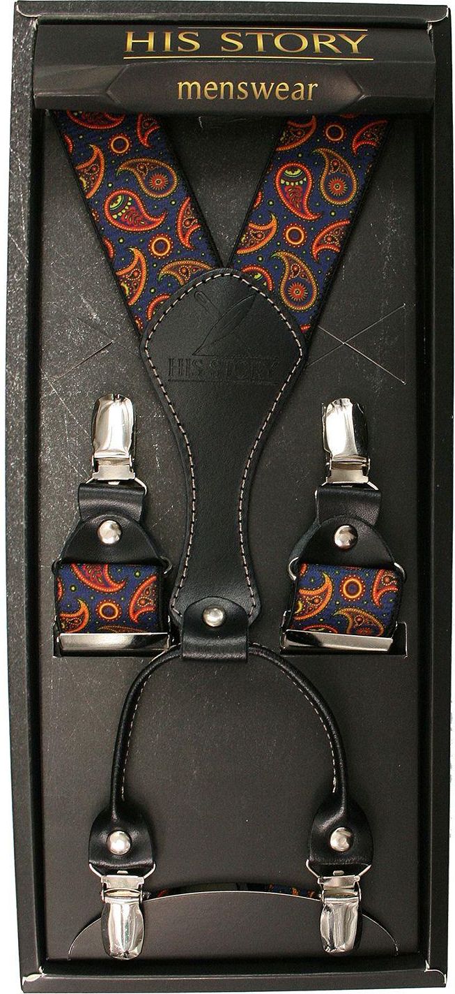 Granatowe Szerokie Szelki Męskie, Skóra Naturalna -HIS STORY- Stylowe, w Pomarańczowy Wzór Paisley SZHSTR0052 Jedlicze