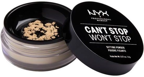 NYX Professional Makeup Can't Stop Won't Stop Setting Powder Puder utrwalający Puder sypki z serii Can't Stop Won't Stop.  Może być aplikować w strefie T, jak również na całej twarzy w tym także w okolicy pod oczami.  Puder pozostawia na skórze matowe, gładkie wykończenie.  Idealnie utrwala produkty kremowe - podkład i korektor.  Zapobiega błyszczeniu się skóry.  Lekka formuła gwarantuje komfort w ciągu dnia.