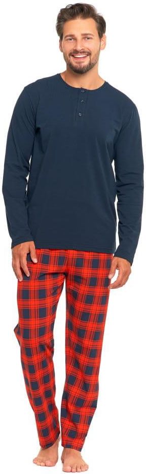 Piżama męska Moraj z długim rękawem wykonana z bawełny z dodatkiem elastanu. Koszulka z długim rękawem w kolorze granatowym, dekolt zapinany na guziki. Do kompletu długie spodnie w elegancką kratkę. Skład: 95 % bawełna 5% elastan