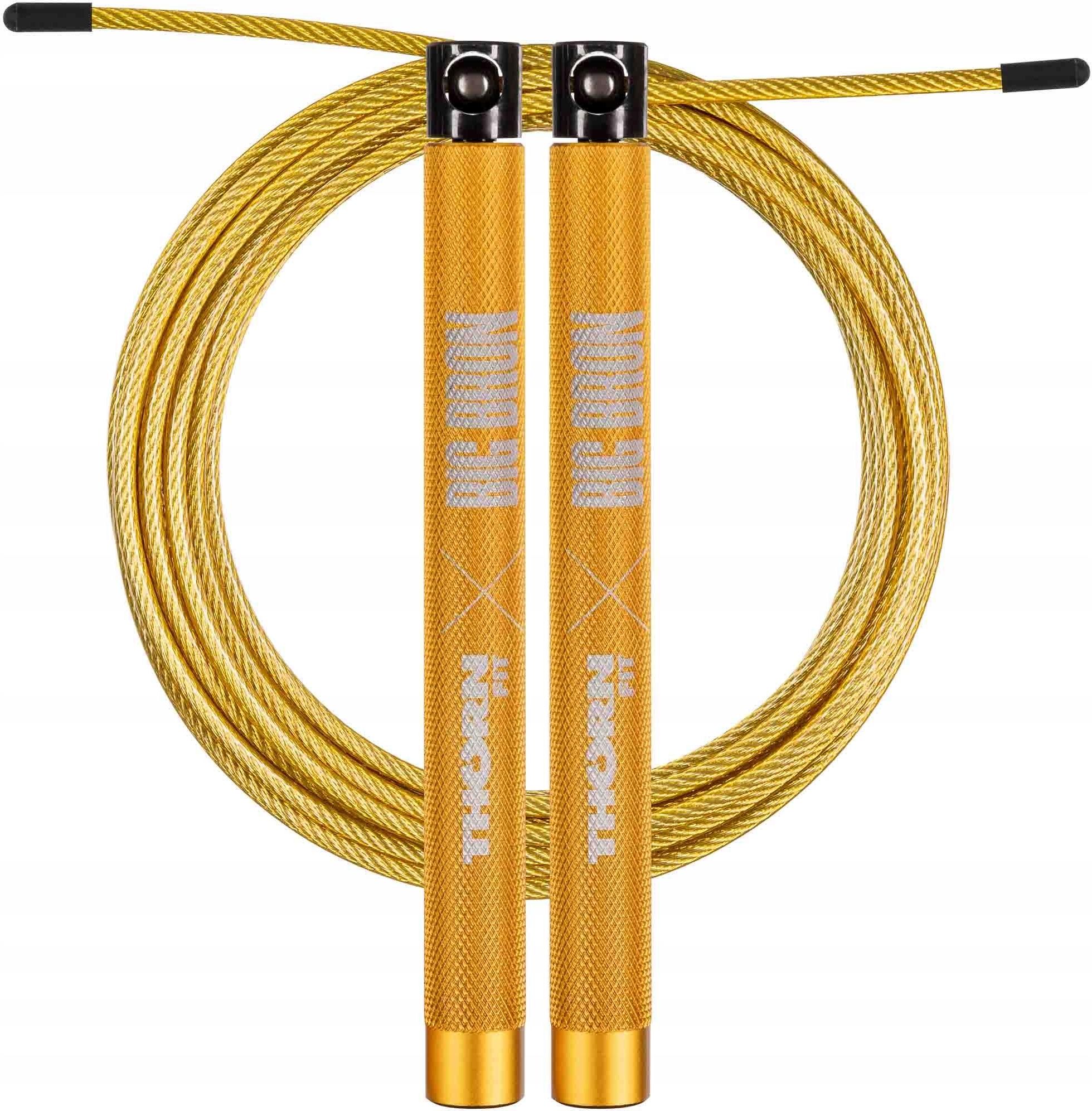 Skakanka THORN FIT x BIG BRON ULTRA 4.0 Skakanka THORN FIT x BIG BRON ULTRA 4.0 Skakanka Ultra 4.0 z kolekcji THORN FIT x BIG BRON to niezwykle techniczny i wytrzymały produkt. Skakanka wraz z akcesoriami zapakowana jest w hard case oraz kartonik - idealnie nadaj się na prezent. W zestawie znajdziesz 3 nowe linki o średnicy 2,2 mm - złotą, czarną oraz linkę bez osłony. Aluminiowe rączki zakończone obrotowymi, łożyskowanymi głowicami wyposażone są w stalowe kulki z przelotką w których osadzona jest końcówka linki. Dzięki takiej budowie linka porusza się swobodnie w kilku płaszczyznach znacznie usprawniając trening i pozwalając na ultra szybkie wykonywanie wod’ów. Rączka skakanki została wyposażona w radełkowaną strukturę, dzięki której skakanka nie wysunie się z dłoni nawet podczas długiego treningu. W skakance Ultra 4.0 zastosowaliśmy super szybkie łożyska, żeby uzyskać jeszcze większą płynność przy każdym zamachu. Skakanka Ultra 4.0 THORN FIT x BIG BRON jest jeszcze lżejsza, precyzyjnie wykończona. Rękojeść jest wyjątkowo ergonomiczna, świetnie układa się w dłoni podczas treningu i jest wymodelowane w taki sposób, aby zwiększyć zamach podczas skakania double unders. Zakres użytkowania skakanie przez skakankę, double-unders, criss-cross Specyfikacja długość radełkowanej rączki: 12,2 cm (całkowita długość: 14,6 cm) aluminiowe rączki z ruchomymi łożyskowanymi głowicami średnica rączki: 14 mm średnica złotej linki: 2,2 mm długość stalowej linki: 3,6 m regulowana długość linki transparentna złota osłonka linki zabezpieczająca przed przecieraniem hard case w zestawie zapewnia wygodę przechowywania waga: 128g (razem z linką 3,6 m) dodatkowa czarna linka (2,2 mm, 3,6 m) dodatkowa linka bez osłony (2,2 mm, 3,6 m) zestaw naprawczy: 2 stalowe gwintowane kulki ze śrubkami, 2 zaślepki, klucz imbusowy Uwaga ! stalowa linka bez osłony zwiększa ryzyko obrażeń podczas użytkowania skakanki ! po dopasowaniu długości skakanki należy odciąć nadmiar linki dla osiągnięcia lepszego zamachu i szybkości ! po dopasowaniu długości skakanki należy dokładnie dokręcić śruby w stalowych kulkach ! regularnie, przed treningami sprawdzaj stopień dokręcenia śrub w skakance Kolekcja THORN FIT x BIG BRON Wyjątkowa kolekcja stworzona z utytułowanym zawodnikiem i naszym ambasadorem Bronisławem Olenkowiczem stanowi kolejny krok w naszej wieloletniej współpracy. Pracowaliśmy razem w pocie czoła nad stworzeniem sygnowanych produktów THORN FIT x BIG BRON, które będą wyróżniać się designem, a zaraz będą funkcjonalne na każdym treningu. Przed Wami kolekcja BIG BRON!Kolekcja BIG BRON zawiera produkty dla każdego crossfitowego maniaka. Nieważne dopiero zaczynasz przygodę, czy jesteś starym wyjadaczem, używanie tych produktów będzie efektywne za każdym razem, kiedy przekroczysz próg Twojego boxa. Dodatkowo produkty te wspierają Bronka w jego startach w zawodach m.in. w nadchodzących pod koniec sierpnia CrossFit Games Masters w Birmingham (USA).