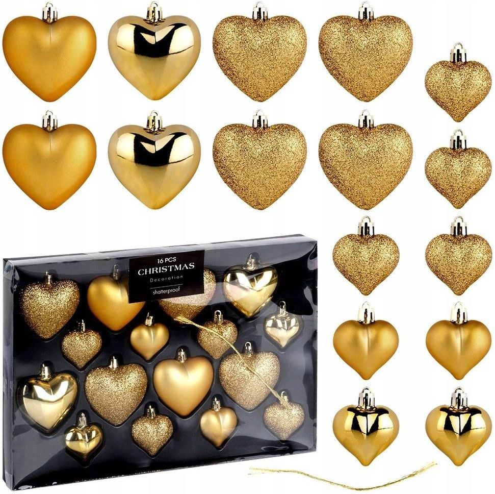 Zestaw 16 szt. bombek na choinkę - Zestaw 16 bombek w kształcie serduszka kolorze złotym, które dodadzą klasycznego blasku każdej choince i stworzą magiczną atmosferę w domu. Serduszka mają średnicę 6,5 oraz 4,5 cm. W zestawie znajdują się bombki w wersji błyszczącej, matowej i brokatowej oraz sznureczki do ich zawieszenia. Bombki nietłukące - Bombki wykonane są z najwyższej jakości tworzywa, więc nie potłuką się. Są dużo bardziej trwalsze i bezpieczniejsze od szklanych bombek. Swoim wyglądem przypominają bombki szklane. Idealne do domów, gdzie są małe dzieci oraz zwierzęta. Kształt serduszka - Bombki mają efektowny kształt serduszka i prezentują się niezwykle stylowo. Dzięki nim można stworzyć niepowtarzalny, świąteczny klimat w każdym wnętrzu. Idealne na choinkę i dekoracje świąteczne - Bombki doskonale nadają się do dekorowania choinki, wieńców, girland, a także do tworzenia oryginalnych świątecznych aranżacji w całym domu. Pomysł na prezent - Bombki będą idealnym prezentem dla osób, które cenią sobie eleganckie dekoracje świąteczne. Świetnie sprawdzą się jako podarunek dla rodziny, przyjaciół lub miłośników świątecznych ozdób, którzy lubią tworzyć wyjątkowy nastrój w swoim domu. Zestaw 16 sztuk nietłukących bombek. W zestawie: 8x serduszka o średnicy 6,5 cm (2x matowe, 2x błyszczące, 2x brokatowe), 8x serduszka o średnicy 4,5 cm (2x matowe, 2x błyszczące, 2x brokatowe). Bombki prezentują się bardzo efektownie. Niezbędne do dekoracji choinek, kompozycji świątecznych i stroików. Będą stanowić wyjątkową ozdobę na choince. Z ich pomocą możemy w modnym stylu ubrać swoje drzewko świąteczne. Wyprodukowano zgodnie z europejskimi standardami.