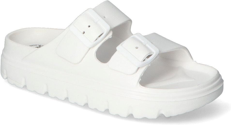 Wygodne klapki marki N.E.W.S :- cholewka wykonana została z tworzywa syntetycznego - wnętrze pokryte zostało tworzywem syntetycznym aby zapewnić komfort podczas użytkowania - podeszwa o grubości 4 cm zapewnia stabilizację - idealnie sprawdzą się na basen, na plażę czy też do codziennego użytku - Klasyczny biały kolor i modny fason tworzą zachwycający efekt!