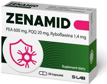 Kiedy stosujemy Zenamid\? Dla osób dorosłych w celu uzupełnienia diety w składniki zawarte w produkcie. Zenamid - działanie Składniki aktywne zawarte w produkcie: Palmitoiloetanolamid. (PEA) to endogenny, czyli samodzielnie syntetyzowany przez organizm człowieka lipid sygnałowy, odpowiedzialny za regulację różnych procesów metabolicznych. Należy do grupy amidów kwasów tłuszczowych. Jego struktura złożona jest z hydrofobowego łańcucha palmitynowego oraz polarnej grupy etanolamidowej, co nadaje mu właściwości amfipatyczne. Dzięki temu PEA może oddziaływać zarówno z lipidowymi błonami komórkowymi, jak i rozpuszczać się w środowisku wodnym, ułatwiając udział w procesach biologicznych. PEA syntetyzowany jest miejscowo w odpowiedzi na różne czynniki stresowe, w tym urazy komórek, czy stres oksydacyjny, min. zachodzące w układzie nerwowym1. Odgrywa rolę w wielu procesach biochemicznych zachodzących w organizmie. PEA powstaje w organizmie głównie w wyniku hydrolizy fosfolipidów błonowych i może uczestniczyć w modulacji aktywności enzymów oraz receptorów związanych z homeostazą komórkową, w tym komórek nerwowych.2 PQQ, czyli sól disodowa chinonu pirolochinoliny, to małocząsteczkowy związek, zaliczany do grupy chinonów. Występuje naturalnie w śladowych ilościach w żywności, m.in. w fermentowanej soi, pietruszce, kiwi czy zielonej herbacie. PQQ charakteryzuje się wyjątkową stabilnością chemiczną. Jest silnym przeciwutleniaczem – neutralizuje reaktywne formy tlenu, wspierając organizm w walce ze stresem oksydacyjnym. Uczestniczy w wielu procesach metabolizmu komórkowego na poziomie mitochondrialnym.3 PQQ zostało zatwierdzone jako bezpieczny, innowacyjny składnik żywności przez Europejski Urząd ds. Bezpieczeństwa Żywności (EFSA), w dawce do 20 mg/ dzień dla zdrowych dorosłych z wyłączeniem kobiet w ciąży i karmiących. Ryboflawina (witamina B2) jest witaminą rozpuszczalną w wodzie, zbudowaną z rybitolu, w którym grupę hydroksylową z pozycji 1 zastąpiono flawiną. Ryboflawina bierze udział w przemianie węglowodanów, tłuszczu i białka oraz wytwarza energię w łańcuchu oddechowym. Jest odpowiedzialna za przebieg procesów oksydacyjno-redukcyjnych, prawidłowe funkcjonowanie śluzówki przewodu pokarmowego, nabłonka naczyń krwionośnych i skóry oraz błon śluzowych dróg oddechowych. Odpowiada również za prawidłowe funkcjonowanie zarówno ośrodkowego, jak i obwodowego układu nerwowego, a także odgrywa istotną rolę w procesie widzenia. Przypisy: 1 Ramona D’Amico, Daniela Impellizzeri, Salvatore Cuzzocrea, Rosanna Di Paola; Palmitoylethanolamide and Its Formulations on Management of Peripheral Neuropathic Pain; National Library of Medicine, Int J Mol Sci. 2020 Jul 27;21(15):5330 2 Stefania Petrosino, Vincenzo Di Marzo; The pharmacology of palmitoylethanolamide and first data on the therapeutic efficacy of some of its new formulations; National Library of Medicine, Br J Pharmacol. 2016 Sep 29;174(11):1349–1365 3 Tingdong Yan a, Muhammad Farrukh Nisar, Xiaomeng Hu b; Pyrroloquinoline Quinone (PQQ): Its impact on human health and potential benefits; Curr Res Food Sci.2024 Oct 22;9:100889 Jaki jest skład Zenamid\? Składniki zawarte w produkcie ZENAMID: PEA (palmitoiloetanoloamid), PQQ (sól disodowa chinonu pirolochinoliny), witamina B2 (ryboflawina), substancje wypełniające: fosforan triwapniowy, stearynian magnezu, otoczka kapsułki: hydroksymetylopropyloceluloza, barwnik kapsułki: tlenek cynku. Dane o produkcie: Składniki: W 1 kapsułce Referencyjna wartość spożycia (RWS) PEA 600 mg Nie została ustalona PQQ 20 mg Nie została ustalona Witamina B2 1,4 mg 100\% Jakie są przeciwwskazania do stosowania Zenamid\? Przeciwwskazania: • Nie stosować w przypadku nadwrażliwości na którykolwiek składnik preparatu. • Produkt nie jest przeznaczony dla dzieci, kobiet ciężarnych i karmiących piersią. • Nie stosować jednocześnie z lekami przeciwzakrzepowymi bez konsultacji z lekarzem. Zenamid zalecane spożycie Sposób użycia : Dorośli: 1 kapsułka, raz dziennie, najlepiej rano, po posiłku. Kapsułkę należy połknąć w całości popijając dużą ilością wody. Suplementu nie stosować u dzieci. Nie należy przekraczać zalecanej dawki preparatu do spożycia w ciągu dnia Zenamid – jakie środki ostrożności należy zachować\? Ostrzeżenia: • Nie stosować po upływie terminu przydatności do użycia • Preparat jest suplementem diety, nie może być stosowany jako substytut (zamiennik) zróżnicowanej diety. • Zalecany jest zrównoważony sposób żywienia i zdrowy tryb życia. Zenamid - uwagi Sposób przechowywania: • Przechowywać w suchym miejscu. Chronić przed światłem i wilgocią. • Przechowywać w zamkniętym opakowaniu, w temperaturze 15–25 °C. • Przechowywać w sposób niedostępny dla małych dzieci.