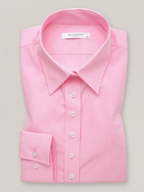 Taliowana koszula damska w drobną różową kratkę z krytym podpinanym kołnierzykiem, 100% bawełny