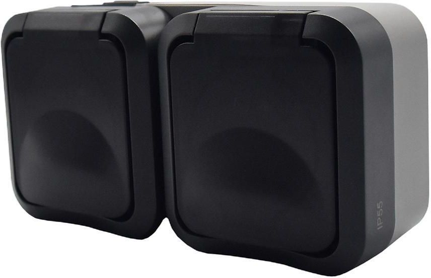 Aqua Pro Gniazdo z uziemieniem podwójne natynkowe, klapka dymna Dane techniczne: stopień ochrony IP: IP55 gniazdo: 2x 2p+z prąd znamionowy gniazda: 16A napięcie znamionowe: 230V~ kolor: szary/grafitowy klapka: tak, dymna rodzaj materiału: tworzywo termoplastyczne