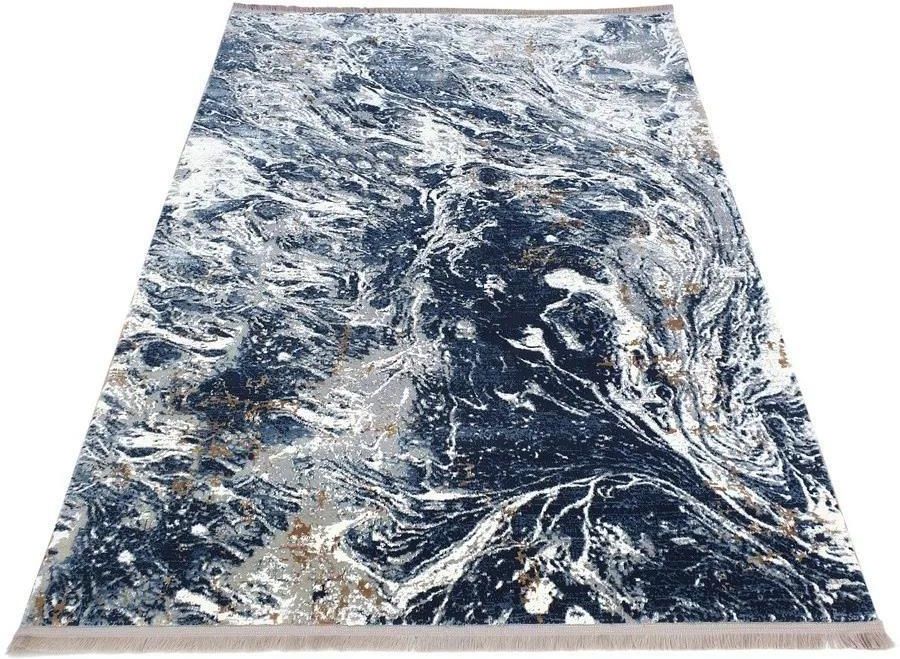 Dywan Exclusive 101 gray navy z kolekcji Exclusive to prawdziwe dzieło sztuki, które przyciąga wzrok swoją niezwykłą kolorystyką i wzorem. Dominującym kolorem jest głęboki, elegancki granat, który nadaje dywanowi klasy i wyrafinowania. Kolor ten jest pięknie przełamany odcieniami szarości, które tworzą dynamiczne, falujące wzory, przypominające ruchy morskich fal lub chmury na niebie. Dodatkowo, w dywanie pojawiają się subtelne akcenty beżu i brązu, które dodają głębi i kontrastu, czyniąc go jeszcze bardziej interesującym. Wzór dywanu jest abstrakcyjny, dynamiczny, z wyraźnymi, płynnymi liniami, które nadają mu nowoczesnego charakteru, jednocześnie przywodząc na myśl naturalne formy, takie jak skały czy krajobrazy. Dywan ma kształt prostokąta, co sprawia, że jest uniwersalny i łatwy do dopasowania do różnych przestrzeni. Na jego brzegach widoczne są delikatne frędzle, które dodają mu tradycyjnego akcentu, jednocześnie nie dominując nad nowoczesnym designem. Jeśli chodzi o inspiracje wnętrzarskie, dywan Exclusive 101 gray navy idealnie sprawdzi się w salonie urządzonym w stylu minimalistycznym lub industrialnym. Wyobraź sobie przestrzeń z betonowymi ścianami, meblami o prostych liniach i metalowymi dodatkami, gdzie dywan ten staje się centralnym punktem, wprowadzając harmonię między surowością a elegancją. Można go również wykorzystać w sypialni, gdzie jego uspokajające kolory stworzą atmosferę spokoju i relaksu, idealną do odpoczynku. W połączeniu z drewnianymi meblami i roślinami doniczkowymi, dywan ten nada wnętrzu przytulności, jednocześnie zachowując nowoczesny styl. Zdecydowanie warto zainwestować w dywan Exclusive 101 gray navy, który przypadnie do gustu osobom ceniącym sobie połączenie nowoczesności z klasyką, oraz tym, którzy szukają elementu dekoracyjnego, który będzie zarówno funkcjonalny, jak i estetyczny. Jego unikalny wzór i kolorystyka sprawią, że każde wnętrze stanie się wyjątkowe, a dywan stanie się jego sercem. Zachęcamy do zakupu, by nadać swojemu domowi niepowtarzalny charakter i styl. Kolekcja EXCLUSIVE 101 gray navy to dywany, które są niezwykle miękkie i przyjemne w dotyku. Dzięki zastosowaniu poliestru charakteryzują się wysoką jakością wykonania, bogactwem kolorów i modnych wzorów. Są doskonałym wyborem dla alergików. Dywany poliestrowe to najbardziej luksusowe dywany ze wszystkich dywanów z włókien sztucznych, są trwałe, nie ugniatają się i nie pylą. Dywany tego typu powstają poprzez termiczną stabilizację włókien, co pozwala na uzyskanie przędzy bardzo przypominającej wełnę naturalną, także odpornej oraz łatwej w czyszczeniu. Spód dywanu wykonany jest z bawełny, dzięki czemu znacznie podnosi jego klasę. Bez problemu poddają się wszelkim zabiegom czyszczącym, praniu szamponem i odkurzaniu. Dywan EXCLUSIVE to luksus, który wniesie poczucie komfortu do Twojego wnętrza.