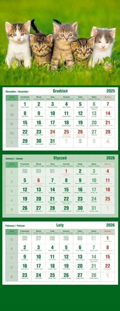 Kalendarz 2024 trójdzielny Koty MICHALCZYK i PROKOP kalendarze __________________________________________________________________ format: 288 x 622 mm układ kalendarium: 3 miesiące – 1 kartka ilość stron: 12 kartek druk: 2 kolory rodzaj papieru: offset 80g/m2 biały główka pełnokolorowa, okienko …