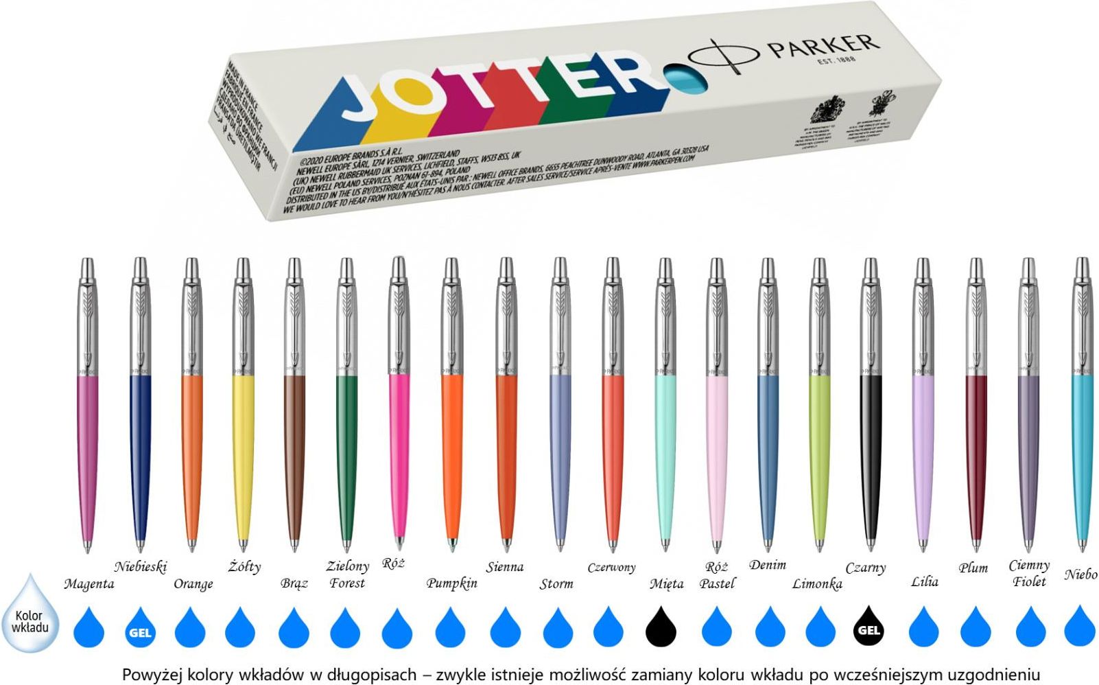 Parker Jotter w etui kartonowym - Jotter ikona na każdy dzień Natychmiast rozpoznawalny Jotter już od 60 lat jest prawdziwą ikoną wzornictwa. Atrakcyjne kolory i charakterystyczny kształt sprawiają, że Jotter od lat pozostaje najpopularniejszym modelem marki Parker, który z pewnością będzie pasował do Twojego stylu. Długopis posiada oryginalny metalowy wymienny wkład Parker z super płynnie piszącym tuszem QUINKflow, solidny plastikowy korpus i nasadkę ze stali szlachetnej z kultowym klipsem w kształcie strzałki Parker. Jest idealny jako codzienny długopis do użytku w domu, w biurze lub w szkole. Parker Jotter Originals Błyszcząca gama 20 kolorów przypomina ducha lat 90-tych. Poznaj udoskonalony styl i czyste linie kultowego projektu Parker Jotter. Charakterystyczny wysuwany przycisk otwiera się i zamyka z satysfakcjonującym kliknięciem. Niezwykle odporny na zarysowania plastikowy korpus. Oferta zawiera długopis Parker Jotter z gamy 20 kolorów w etui kartonowym wykonanym w 95% z materiałów pochodzących z recyklingu. Dodatkowo można dodać do koszyka grawer na nasadce długopisu w promocyjnej cenie. Promocja dla zamówień grupowych Dokonując zakupu min. 15 długopisów w ramach aukcji, grawer wykonamy gratis - dodajemy do koszyka "Bezpłatny grawer przy zakupie min. 15 długopisów". Domyślnie kolor magenta - możliwość zamiany na inny z pokazanej gamy. Istnieje możliwość zamiany koloru wkładu po wcześniejszym uzgodnieniu mailowym (sklep@parker-shop.pl)