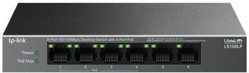 SWITCH TP-LINK LS106LP Najważniejsze cechy 6x portów 10/100Mb/s (automatyczna negocjacja szybkości połączeń, automatyczne krosowanie Auto MDI/MDIX) 4x porty PoE+ 41W łącznej mocy PoE Tryb Extend: przełącznik może osiągnąć zasięg transmisji PoE do 250 metrów, dzięki czemu idealnie sprawdzi się …