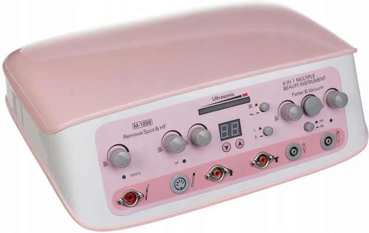 Kombajn kosmetyczny 6w1 BR-1898 to specjalistyczny sprzęt dla salonów SPA i gabinetów medycyny estetycznej, który wykonuje aż 6 zaawansowanych zabiegów pielęgnacyjnych, oraz terapeutycznych. Aparat wykonuje m.in. profesjonalny zabieg ujędrniania biustu, który bije rekordy popularności. Urządzenia kosmetyczne dla salonów muszą spełniać najwyższe standardy bezpieczeństwa, Kombajn kosmetyczny 6w1 BR-1898 gwarantuje Twoim Klientom 100% komfort oraz wysoką skuteczność zabiegów. Oto 6 zabiegów, które wykonuje nasz kombajn kosmetyczny: Funkcje: Ultradźwięki - ultrasonoforeza, High-Frequency - elektroterapia, Vacuum, Spray, Ujędrnianie biustu, Remove spot. 1. Ultradźwięki - ultrasonoforeza: Wykorzystuje zjawisko fali akustycznej. Powoduje poprawę ukrwienia skóry, stosowany przy terapiach antycellulitowych, leczeniu rozstępów, nerwobóli, odmrożeń. Umożliwia wtłaczanie w głębsze warstwy skóry preparatów odżywczych, nawilżających, regenerującym i dotleniających. 2. High-Frequency - elektroterapia: Umożliwia wykonywanie elektromasaży z wykorzystaniem tzw. prądów d'Arsonvala. Występujące przy kontakcie szklanej elektrody ze skórą iskrzenie ma wpływ pobudzający na skórę i tkanki podskórne, mięśnie oraz pośrednio na narządy wewnętrzne, a wytwarzany przy zabiegu ozon ma działanie bakteriobójcze. Działanie ładunków elektrycznych powoduje rozszerzenie naczyń krwionośnych skóry, przyspiesza przemianę materii, co jest ważnym czynnikiem zwiększenia absorbcji substancji odżywczych i leczniczych zawartych w preparatach kosmetycznych. 3. Vacuum: Podciśnienie (ssanie) jest wykorzystane do masażu próżniowego zapewniającego lepsze ukrwienie powierzchni skóry i ogólną poprawę krążenia w obszarze przeprowadzonego zabiegu, a także służy do zamykania porów oraz usuwania zanieczyszczeń skóry pochodzenia komórkowego. Pomocne w głębokim oczyszczaniu skóry. 4. Spray: Nadciśnienie które może być użyte do rozpylania płynów takich jak toniki, wody lub olejki zapachowe czy inne preparaty kosmetyczne ( np. preparaty do opalania natryskowego) oraz do nawilżania metodą zimnego natrysku. 5. Ujędrnianie biustu: Masaż ssący rytmiczny wykorzystywany między innymi do zabiegów powiększających i liftingujących biust. Masaż działa zarówno na tkanki jak i mięśnie. Aparat zasysa i zwalnia partie ciała poddane zabiegowi, w ten sposób poddając je intensywnej gimnastyce, która polepsza znacznie mikrocyrkulację. Zabieg taki poprawia jędrność biustu oraz usuwa rozstępy. 6. Remove spot: Zamykanie naczynek oraz usuwanie zmian pigmentacyjnych i narośli za pomocą prądu wysokiej częstotliwości. Dane techniczne: Zasilanie: 110/220V Wymiary urzadzenia: 38x29x13cm, Waga: 7kg Wymiary opakowania: 45x33x26cm, Gwarancja: 12 miesięcy