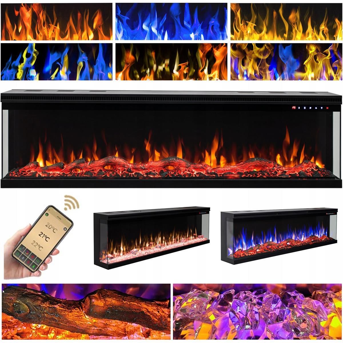 Kominek elektryczny ścienny LED AFLAMO Unique 254 Unikalne cechy Nowoczesny wygląd Kominek wyróżnia się przede wszystkim doskonałym wykończeniem. Zastosowany ekran LED bardzo dobrze imituje wygląd prawdziwego ognia w klasycznych kominkach. Dla spotęgowania efektu zastosowano na froncie szkło.Trójstronne palenisko robi imponujące wrażenie. Cienkie ramki pozwalają cieszyć się z większej powierzchni paleniska. Aż 3 możliwości montażu na ścianie po części zabudowany całkowicie zabudowany Polana w nowej odsłonie! Ten model jest teraz dostępny z nowymi polanami ceramicznymi, które wyglądają jeszcze bardziej realistycznie! Wygoda użytkowania dzięki aplikacji mobilnej Prezentowany kominek elektryczny jest sterowany za pomocą aplikacji mobilnej! Oczywiście możecie również używać wszystkich funkcji, korzystając z wygodnego panelu dotykowego. Dostępna na urządzeniach z Android i iOS. Wszystkie funkcje kominka dostępne z poziomu telefonu. Naszą aplikację można pobrać z Google Play oraz Apple Store wyszukując "AFLAMO". Kominek Unique to przede wszystkim 2 poziomy grzania: 750 W / 1500 W Wykrywanie otwartego okna Cyfrowy termostat: regulacja w zakresie od 18 do 30°C Sterowanie z poziomu aplikacji AFLAMO na telefonie, pilota lub panelu na kominku 2 paleniska w zestawie: polana, kryształki 6 efektownych kolorów płomienia 3 prędkości płomienia 10 kolorów podświetlenia paleniska 5 poziomów jasności paleniska Zastosowanie o każdej porze roku - funkcja grzania niezależna od płomienia Trójstronne palenisko Wymiary kominka Szerokość: 254 cm // Wysokość: 43 cm // Głębokość: 20 cm Opakowanie zawiera kominek zestaw palenisk pilot zdalnego sterowania akcesoria montażowe instrukcja obsługi i montażu profile styropianowe zabezpieczające kominek przed uszkodzeniami Płomień (wyświetlany przez ekran LED) 6 kolorów 3 prędkości Palenisko polana kryształki 10 kolorów podświetlenia 5 poziomów jasności Wygoda i komfort Nie we wszystkich pomieszczeniach jest możliwy montaż prawdziwego kominka. Kominki LED stworzono właśnie po to, by zmienić! Zapewnij sobie odrobinę relaksu! Aplikacja sterująca na telefon lub pilot - bardzo wygodne rozwiązanie umożliwiające sterowanie wszystkimi funkcjami kominka z kanapy czy fotela. Dogrzewanie - dzięki niskiemu poborowi prądu oraz efektywnej pracy kominek doskonale dogrzeje pomieszczenie w którym się znajduje. Wyłącznik czasowy - dzięki niemu nie musisz martwić się o to, czy na pewno wyłączyłeś kominek. Brak konieczności wentylacji - eliminuje ryzyko dostania do pomieszczenia wilgoci pleśni oraz nie zaburza naturalnej wentylacji w pomieszczeniu. Doskonały na każdą porę roku! Kominek może być używany zarówno z ogrzewaniem, jak i bez niego. Wszystko dlatego, że efekt płomienia jest niezależny od funkcji dogrzewania. Dzięki temu urządzenia można używać również w upalne dni poprzez wyłączenie funkcji grzania w dowolnym momencie. Kominek LED vs Kominek tradycyjny Brak konieczności zakupu oraz magazynowania drewna. Koniec z dymem, kurzem i popiołem. Koniec z czyszczeniem kominka i sprzątaniem wokół niego. Zwiększone bezpieczeństwo dzięki zastosowaniu czujnika zapobiegającego przegrzaniu. Pozostałe zalety Energooszczędna technologia LED 2 poziomy mocy grzewczej: 750 W / 1500 W Regulacja temperatury: od 18 do 30°C Zabezpieczenie przed przegrzaniem Czujnik otwartego okna wyłączający kominek przy nagłym spadku temperatury 3 Opcje montażu - ścienny, częściowo zabudowany lub całkowicie zabudowany Trójstronne palenisko Cienkie ramki