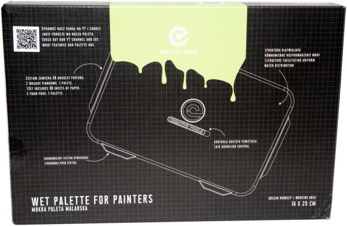 Mokra paleta firmy Creative Tools o unikalnym wzornictwie zaprojektowana przez profesjonalnych polskich malarzy. Paleta posiada duży obszar roboczy 16x24cm, zawór kontroli dostępu powietrza (regulacja wilgotności), perforację dolnej części zapobiegającą pleśnieniu gąbkowego wkładu. Jeśli wolisz Polskie produkty to stawiaj na ten! W zestawie otrzymasz: mokrą paletę z opaska do przenoszenia 50 arkuszy papieru 2 gąbki A jak wygląda jej przygotowanie, zobaczysz poniżej: [[youtube(9L5mP-WNJ_io0)]] Wiek: Producent/osoba odpowiedzialna za bezpieczeństwo produktuGIEROS, Marcin GierosKwiatkowice Kolonia 8a98-105 Wodzieradybiuro@creativetool.com.pl