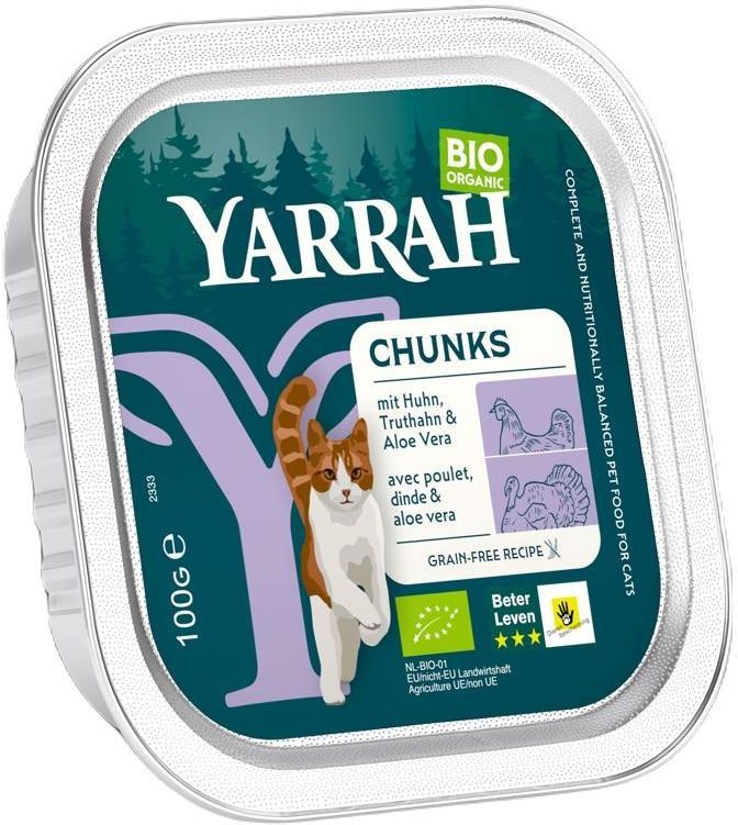 SKŁADNIKI 55 % bulion* [woda, produkty pochodzenia roślinnego* (skrobia z tapioki*), substancje mineralne, produkty pochodzenia roślinnego* (lubczyk*), mięso i produkty pochodzenia zwierzęcego* (zmielony mięso z kurczaka*)], 45 % kawałki mięsa* [mięso i produkty pochodzenia zwierzęcego* (62 % kurczak*: mięso z kurczaka*, tusza z kurczaka*, wątróbka z kurczaka*), 18 % indyk* (mięso z indyka*), woda, podukty pochodzenia roślinnego* (0,015 % suszony aloes*) (co odpowiada 3 % świeżego aloesu), produkty pochodzenia roślinnego* (skrobia ziemniaczana*), roślinne ekstrakty białkowe* (białko SOJOWE* w proszku), substancje mineralne)]. (*certyfikowany składnik ekologiczny) OPIS Karma pełnoporcjowa dla kota. SKŁADNIKI ANALITYCZNE białko surowe: 7,5 % zawartość tłuszczu: 6,0 % włókno surowe: 0,4 % popiół surowy: 2,0 % wilgotność: 82 % Dodatki dietetyczne/kg tauryna - 450 mg witamina D3 - 75 IE witamina E - 30 mg cynk - 20 mg mangan - 6 mg miedź - 1 mg jod - 0,5 mg ZALECANE DZIENNE KARMIENIE kot 3 kg: 200 g kot 4 kg: 250 g kot 5 kg: 300 g UWAGA Podawać w temperaturze pokojowej. Należy dostosować ilość karmy do poziomu aktywności i kondycji kota. Należy zapewnić zwierzęciu stały dostęp do świeżej wody. ZALECANE WARUNKI PRZECHOWYWANIA Przechowywać w chłodnym i suchym miejscu. Po otwarciu przechowywać w lodówce i spożyć w ciągu 2 dni.