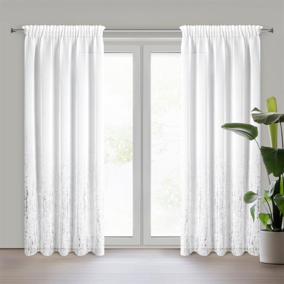 Firana gotowa na taśmie OLIVIA 140x270 marki Eurofirany to wyjątkowa dekoracja okienna w białym kolorze z subtelnym srebrnym nadrukiem, który w połączeniu z przecieranym gumowanym efektem nadaje jej nowoczesny i elegancki wygląd. Tkanina przepuszcza światło, wprowadzając do wnętrza jasną i przytulną atmosferę. Dzięki taśmie, firana jest łatwa w zawieszeniu i układa się w równomierne fale, co zapewnia jej estetyczny wygląd. Przecierany gumowany nadruk wprowadza do wnętrza subtelną teksturę, tworząc unikalny efekt, który pasuje do nowoczesnych oraz industrialnych aranżacji. Firana OLIVIA to doskonały wybór dla osób poszukujących nowoczesnej i wysokiej jakości dekoracji okiennej, która doda pomieszczeniu luksusowego charakteru. Cena podana za 1 sztukę. Producent: Eurofirany Szerokość: 140 cm, długość: 270 cm Kolor: biały Gramatura: 70 GSM Skład: 100% poliester