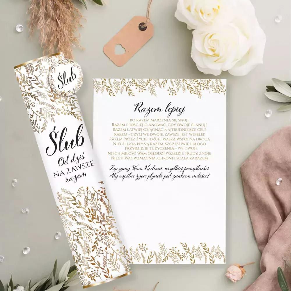 Tuba, pamiątka ślubna, złota Tuba, pamiątka ślubna, złota Tuba wydrukowana jest na wysokiej jakości papierze z uszlachetnieniem złota i tłoczona. Tuba zapakowana w przeźroczystą folię z dodatkiem bileciku. Tuba zawiera w środku ozdobną kartkę z życzeniami i miejscem na podpis.Wymiary: wysokość 25.0 …
