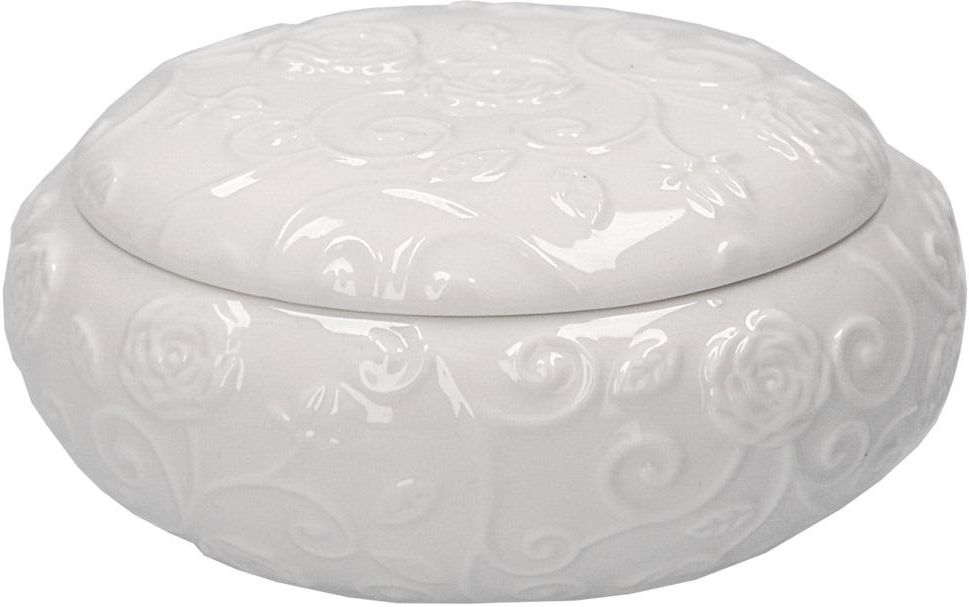 Uroczy pojemnik z pokrywką Florentina o zdobionym rzeźbionym, roślinnym wzorze, który idealnie wpisuje się w styl shabby chic.
