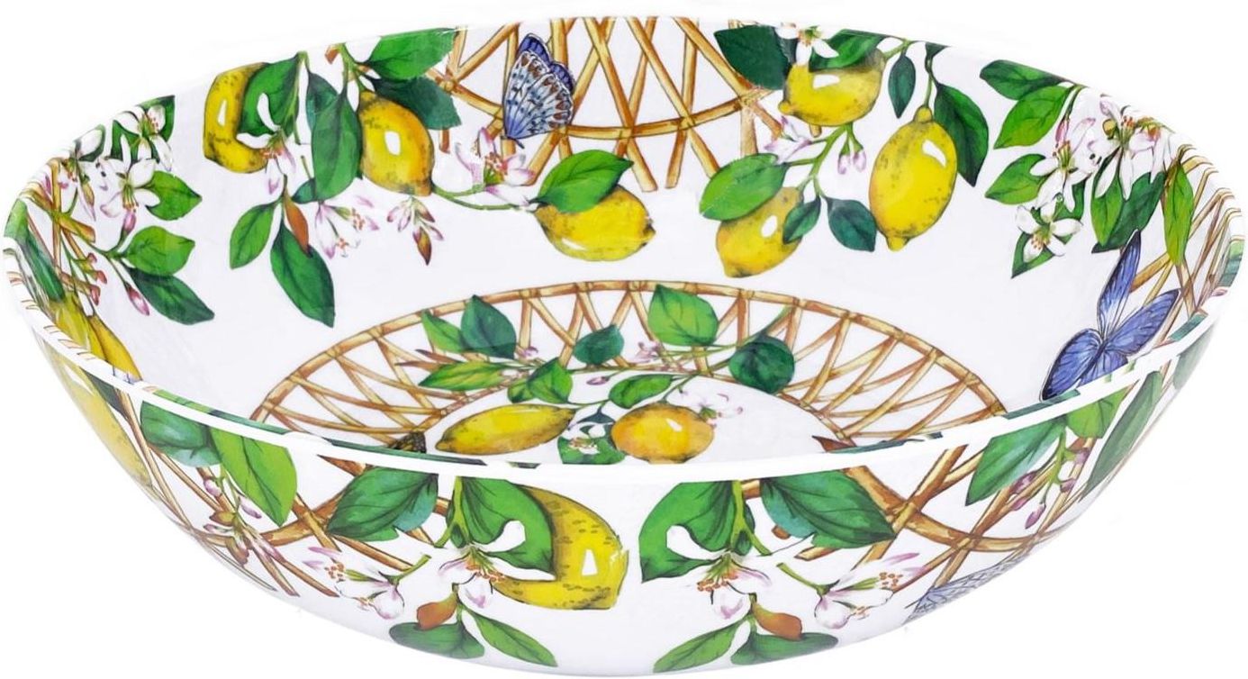 Miska do sałatek średnicy 31 cm i pojemności 4 L z kolekcji Capri. Wykonana z trwałej melaminy. Ozdobiona wzorem m.in. z gałązkami drzewek cytrynowych i motylami.