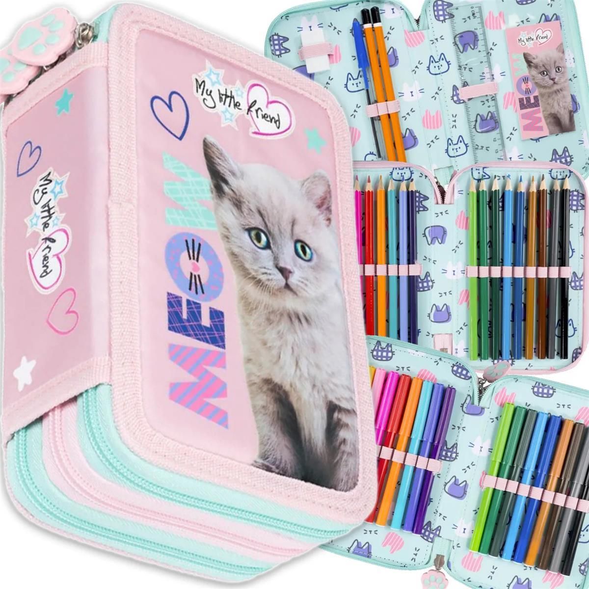 Najważniejsze cechy 3 komory na zamek błyskawiczny – łatwy dostęp i doskonała organizacja Liczne elastyczne mocowania – porządek wśród przyborów Ergonomiczne uchwyty suwaków – wygodne otwieranie nawet dla najmłodszych Wyjątkowy design z motywem puszystego kotka – ulubieniec dzieci Zawartość piórnika 18 kredek szkolnych 18 flamastrów Temperówka Gumka do ścierania 2 ołówki 1 długopis Linijka Notes Wymiary - ok. 20 x 13 x 7 cm