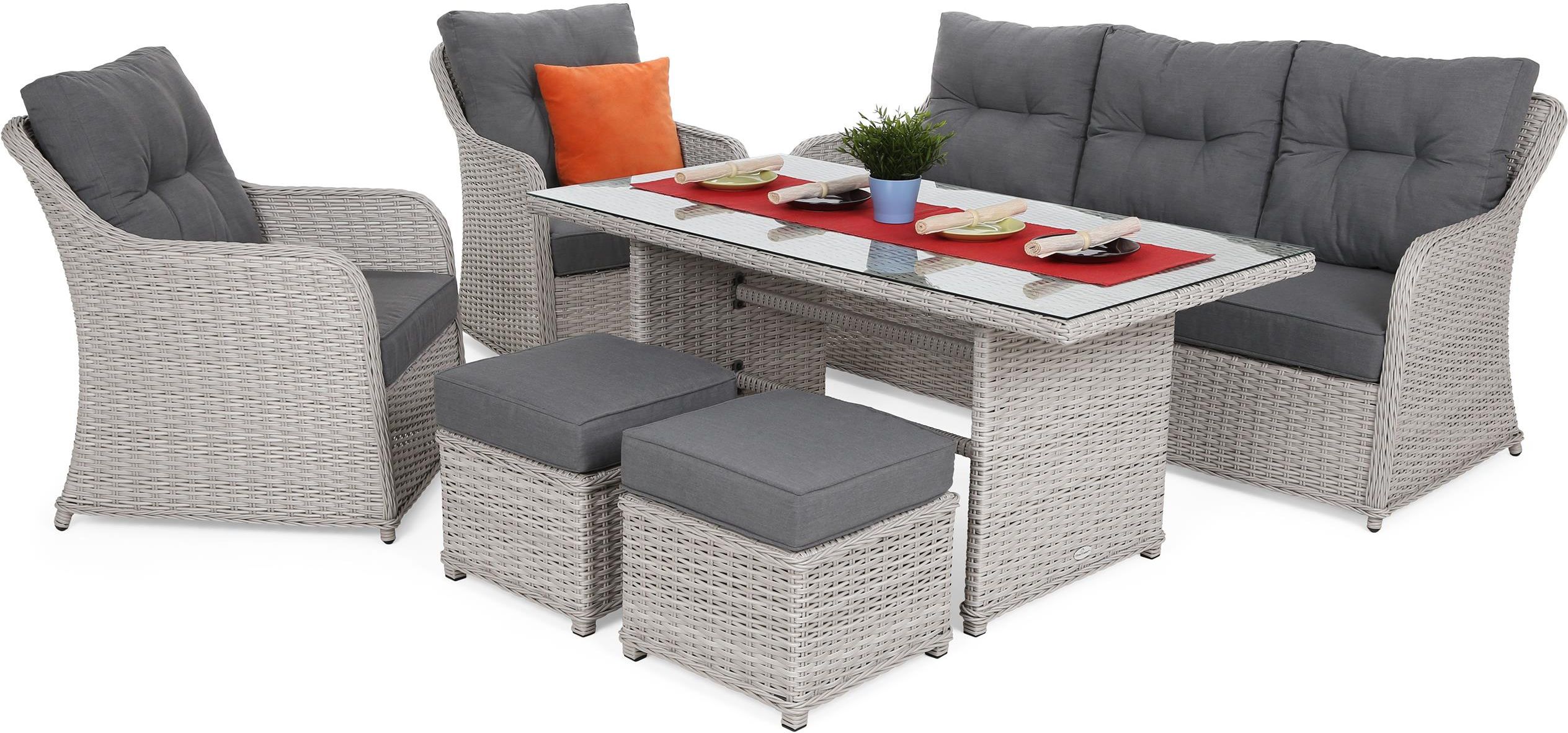 Zestaw mebli Bergamo White / Grey Najważniejsze cechy: dla 7 osób, materiał konstrukcyjny: aluminium malowane proszkowo, pokrycie: technorattan, kolor: pokrycie białe, poduchy szare, w komplecie: stół z szybą, sofa, 2 fotele, 2 pufy, poduchy wg specyfikacji, zestaw montażowy. Kod produktu: 645958 Dane techniczne: liczba osób: 7 materiał konstrukcyjny: aluminium malowane proszkowo pokrycie: technorattan kolor: pokrycie białe, poduchy szare wymiary stołu (szer. x dł. x wys.) lub (średn. x wys.): 81 cm x 151 cm x 69 cm blat stołu / stolika: technorattan + szkło hartowane gr. 5 mm wymiary sofy (szer. x gł. x wys.): 186 cm x 75 cm x 87 cm wymiary fotela (szer. x gł. x wys.): 68 cm x 75 cm x 87 cm wymiary pufa (szer. x gł. x wys.): 45 cm x 45 cm x 32 cm szerokość wewn. siedziska: fotel: 58 cm, sofa: 179 cm głębokość wewn. siedziska: fotel: 63 cm, sofa: 63 cm wysokość siedziska: fotel: 33 cm, sofa: 33 cm szerokość wewn. oparcia: fotel: 58 cm, sofa: 179 cm wysokość wewn. oparcia: fotel: 56 cm, sofa: 56 cm poduchy: siedzisko fotela 58 cm x 64 cm x 11 cm (2 szt.), siedzisko sofy 179 cm x 64 cm x 11 cm (1 szt.), oparcie 60 cm x 53 cm x 17 cm (5 szt.), puf: 43 cm x 43 cm x 11 cm (2 szt.) dodatkowe informacje: waga fotela 10 kg, waga sofy 21 kg, waga pufa 3 kg, waga stołu 25 kg, stół wymaga montażu (blat w całości); produkt wyłącznie do użytku prywatnego w komplecie: stół z szybą, sofa, 2 fotele, 2 pufy, poduchy wg specyfikacji, zestaw montażowy waga: 54 kg