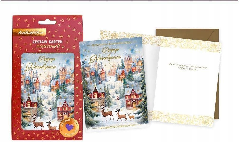 Zestaw kartek świątecznych ZKA-004 Zestaw zawiera 10 jednakowych kartek świątecznych z kopertami. Karnety są kolorowe i uszlachetnione metalizowaną folią hot-stamp. Ten zestaw to idealne rozwiązanie, aby mieć zawsze pod ręką zapas pięknych kartek świątecznych, gotowych do wręczenia bliskim i znajomym w okresie świątecznym. Kartki zawierają życzenia w środku oraz dopasowaną kopertę. Specyfikacja: Wymiary kartki: 10 x 15 cm (po złożeniu) Wymiary opakowania: 11,2 x 1,5 x 20,5 cm (długość x szerokość x wysokość) wnętrze: życzenia w środku zdobienia: metaliczna folia okazja: BN Producent/osoba odpowiedzialna za bezpieczeństwo produktuPassion Cards Sp. z o.o.Bukowska 4162-081 Wysogotowosekretariat@kukartka.pl+48 61 624 56 00