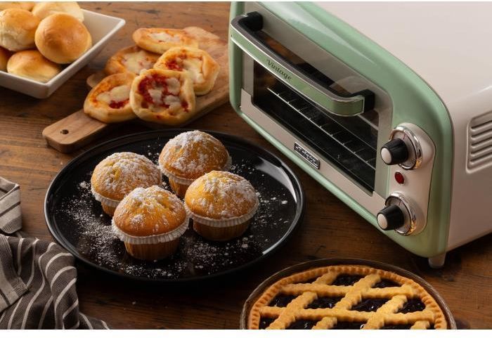 Dlaczego warto kupić piekarnik Ariete 3919/04 Vintage? Styl retro – elegancki włoski design w zielonym kolorze, pasujący do każdej kuchni. Kompaktowy rozmiar – idealny do małych przestrzeni (37 x 31 x 21 cm). Pojemność 10 l – wystarczająca na zapiekanki, pizzerinki i szybkie dania. Moc 800 W i temperatura do 230°C – szybkie i równomierne pieczenie. Płynna regulacja temperatury – kontrola nad każdym rodzajem potraw. Timer 60 minut z alarmem – wygoda i bezpieczeństwo użytkowania. Podwójna szyba i metalowa obudowa – lepsza izolacja i oszczędność energii. W zestawie ruszt i tacka – gotowy do użytku od razu po zakupie. Ariete 3919/04 Vintage – piekarnik, który łączy styl i funkcjonalność Mini piekarnik Ariete 3919/04 Vintage to połączenie włoskiego wzornictwa i praktycznych rozwiązań, które idealnie sprawdzą się w codziennej kuchni. Dzięki kompaktowym wymiarom (37 x 31 x 21 cm) zmieści się nawet w niewielkim wnętrzu, oferując jednocześnie aż 10 litrów pojemności. Urządzenie wyposażone jest w moc 800 W i płynną regulację temperatury od 90 do 230°C, co pozwala na przygotowywanie zarówno delikatnych wypieków, jak i chrupiących dań. Timer do 60 minut z automatycznym wyłączaniem zapewnia wygodę i bezpieczeństwo. Wytrzymała metalowa obudowa, podwójna szyba oraz antypoślizgowe nóżki zwiększają bezpieczeństwo użytkowania i poprawiają efektywność cieplną. W zestawie znajduje się aluminiowa tacka i ruszt ze stali nierdzewnej. Dane techniczne Moc: 800 W Pojemność: 10 litrów Zakres temperatur: 90°C – 230°C Timer: do 60 minut z alarmem Wskaźnik temperatury: LED Kolor: Beżowy Wymiary zewnętrzne: 37 x 31 x 21 cm Wymiary wewnętrzne: 16 x 22 x 24,5 cm Akcesoria w zestawie: aluminiowa tacka, ruszt stalowy