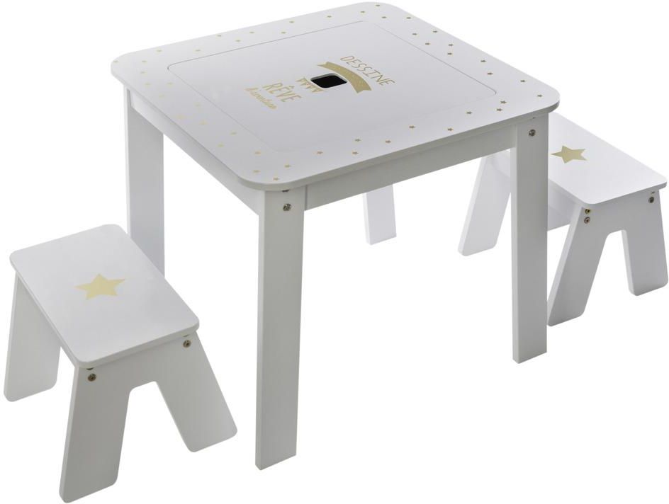 STOLIK DLA DZIECI +2x KRZESEŁKO STOLIK TABLICA 2w1 Praktyczny dodatek dla Twojego dziecka. Producent: Atmosphera Créateur d'intérieur Materiał dominujący: MDF Skład: MDF Francuski producent Atmosphera Créateur d'intérieur tworzy meble dziecięce z dużą starannością, pasją i wielką troską. Stoliki dziecięce i stołki dla dzieci tej marki wyróżniają się dużą funkcjonalnością, urokliwym designem, trwałością i bezpieczeństwem. Podobnie jest w przypadku tego urokliwego białego stolika z krzesełkami, który stworzono z wytrzymałych płyt MDF i wyposażono w uchylny blat, pod którym skrywa się pojemnik do przechowywania akcesoriów pisarskich, zeszytów, książek. Ten stolik dziecięcy to funkcjonalny i bezpieczny mebel o odpowiednio dobranej wysokości, z blatem o dużej przestrzeni, potrzebnej przy zabawie. W trosce o bezpieczeństwo dzieci, rogi stolika są zaokrąglone, a konstrukcję wspierają mocne i stabilne nogi. Dwa stołki drewniane mają również dostosowane do wzrostu dzieci gabaryty. Stylistycznie i kolorystycznie ten stolik drewniany będzie pasował zarówno do pokoju chłopięcego, jak i do pokoju dziewczynki. W skład kompletu mebli dziecięcych wchodzi stolik ze schowkiem oraz dwa taborety dziecięce. Cechy produktu: białe meble dziecięce w gwiazdki, bezpieczny i funkcjonalny stolik z krzesłami dziecięcymi, modna kolorystyka i wzornictwo stolika dla dzieci i krzesełek, wytrzymałe i solidne mebelki dziecięce, wymiary stolika: wysokość: 51 cm, długość: 57 cm, szerokość: 57 cm, wymiary krzeseł: wysokość: 26 cm, długość: 36 cm, szerokość: 19 cm, markowy stoliczek dla dziecka znanej firmy Atmosphera Créateur d'intérieur. Atmosphera stworzona dla Ciebie Znając potrzeby i oczekiwania naszych klientów, stworzyliśmy niebagatelną listę artykułów, dzięki którym Twój dom stanie się nie tylko przyjemnością, ale przede wszystkim dziełem naznaczonym indywidualnością i wyczuciem dobrego stylu. Atmosphera to francuska marka, która oferuje bogatą gamę dekoracji, mebli oraz dodatków do każdego wnętrza. Każdy produkt został opracowany z pasją i francuskim kunsztem, dzięki czemu produkty marki Atmosphera pomogą w wyposażeniu pomieszczeń urządzonych w różnych stylach. 34773