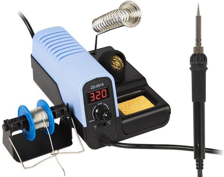 Stacja lutownicza z regulacją temperatury PR-ZD-8919. Idealnie sprawdza się przy drobnych naprawach, pracach serwisowych, zastosowaniach domowych itd. CECHY: - Wysoka jakość, kompaktowy wygląd - Bezpieczeństwo pracy, izolowana grzałka - Wymienne groty - Cyfrowy wyświetlacz - Niewielkie wymiary, prosta obsługa - Szybki czas nagrzewania Dane techniczne: - Temperatura pracy: 160°C - 480°C - Zasilanie: AC 220V - 240V - Moc: 30W (max. 130W) - Cyfrowy wyświetlacz LED (°C / °F)