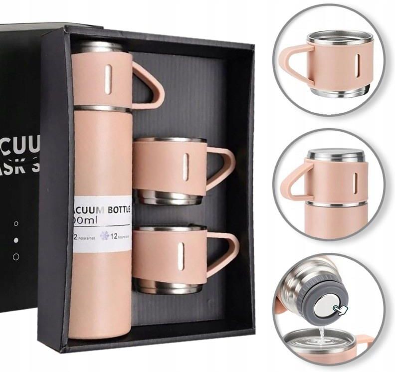 Ecarla Zestaw Termos Z 3 Kubkami Zapakowany Na Prezent, 500Ml Różowy Bd24R Jeziorany