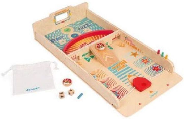 Janod Bilard Holenderski a Gra zręcznościowa Bilard holenderski francuskiej marki JANOD to wspaniała zabawa, zarówno dla dwójki dzieci, jak i dziecka oraz rodzica. W skład zestawu wchodzi drewniana plansza z nieco wyższymi bocznymi brzegami, rampą, wieloma punktowanymi polami, trzema okienkami, przez które mogą przelatywać krążki graczy i ściankami-przeszkodami, od których mogą się odbijać oraz gumką z klockiem do wystrzeliwania tych krążków. W komplecie są ponadto: 2 drewniane krążki-zawodnicy, 2 kostki z punktami oraz 4 kołeczki, które kolorami odpowiadają punktowanym polom na planszy (niebieski, żółty, czerwony i zielony). Celem gry jest strzelanie swoim zawodnikiem tak, by trafiał on na jak najwyżej punktowane pole. Gracz, któremu uda się zdobyć najwięcej punktów – wygrywa. Gra ta ćwiczy koordynację ruchową, wspiera relację ręka-oko, uczy cierpliwości i skupienia. a Gry rozbudzają wyobraźnię, myślenie strategiczne i planowanie. To wspaniała rozrywka dla całej rodziny. Gra została zaprojektowana we Francji. Drewno, z którego wykonane są jej elementy, posiada certyfikat FSC, co oznacza że pochodzi z lasów zarządzanych w sposób zrównoważony. Gra zapakowana jest w estetyczne pudełko. W komplecie posiada ściągany sznurkiem woreczek na drobniejsze części. Idealnie nadaje się na prezent. Zabawka rozwija: umiejętność współpracy i dzielenia się małą motorykę wiek: 6+ liczba elementów: 9 materiał: drewno FSC design: Francja wymiary produktu: 30,5 x 60 x 10 cm waga produktu: 1,30 kg wymiary opakowania: 61,5 x 31 x 10,5 cm bezpieczeństwo i jakość: EN71-1; EN71-2, EN71-3; REACH a a Janod od 1970 roku niezmiennie projektuje zabawki, które są synonimem innowacyjności, francuskiego designu i najwyższej jakości. Unikalne zabawki Janod tworzone są z drewna i innych doskonałych materiałów, a przede wszystkim z dziecięcych marzeń!  W obecnej ofercie Janod jest ponad 500 produktów, z których kluczowe to zabawki drewniane, puzzle, układanki i zabawki magnetyczne. Wszystkie produkty projektowane są we Francji przez własnych designerów. Stąd wiele motywów i wzorów powtarza się w kolekcjach, tworząc wyjątkowy, bajkowy świat Janod.  Wszystkie zabawki tworzone są z dbałością o szczegóły, z najwyższej jakości materiałów, bezpiecznych dla dzieci. Zabawki spełniają restrykcyjne normy bezpieczeństwa, takie jak EN71-1, EN71-2, EN71-3 oraz REACH.