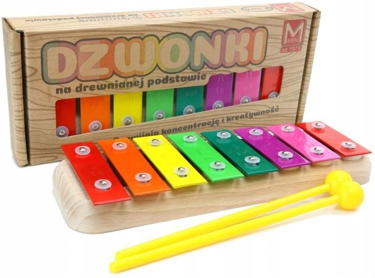 Dzwonki 8-tonowe kolorowe na drewnianej ramce MAREK ✅ ✔️ Zabawka – instrument muzyczny perkusyjny, złożony z szeregu metalowych płytek (tonów strojonych elektronicznie). Zabawka dzięki której dziecko poznaje nuty oraz uczy się grać proste melodie piosenek przy użyciu dwóch pałeczek. Zabawa z …