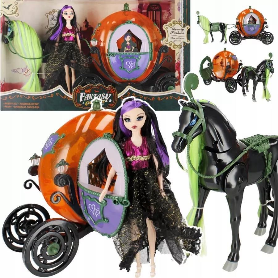 Kareta z lalką i koniem (światło + dźwięk) 524860 Mega Creative Fantastyczna kareta w zestawie z lalką w balowej sukni i majestatycznym koniem przeznaczona do wspaniałej zabawy dla dzieci. Kareta w kształcie pomarańczowej dyni została ozdobiona świecącymi lampionami i wyposażona w otwierane drzwi oraz obrotowe koła umożliwiające poruszanie się po wybranej powierzchni. Czarny koń będący częścią zestawu odznacza się bardzo długą, zielono-szarą grzywą i ogonem, które możemy stylizować i tworzyć niesamowite fryzury. Na jego grzbiecie znajduje się ciemnozielone siodło. Jest zasilany za pomocą baterii, co sprawia, że potrafi poruszać się i wydawać dźwięki. Dodatkowo w zestawie znajdziemy również piękną lalkę w balowej sukni o długich, czarnych włosach z fioletowymi pasemkami. Na jej ustach możemy zauważyć wampirze kły. Wszystkie elementy zestawu zostały umieszczone w opakowaniu z okienkiem, dzięki czemu są doskonale widoczne. Zawartość opakowania: 1 x kareta na baterie, 1 x koń na baterie, 1 x lalka w sukni balowej. Baterie: kareta - 2xAA 1,5V (brak w zestawie), koń - 3xAA 1,5V (brak w zestawie) Wymiary produktu: kareta - 36x34x18cm, koń - 28x28x8cm, lalka - 29cm Wymiary opakowania: 60x34x20cm Wiek: 3+