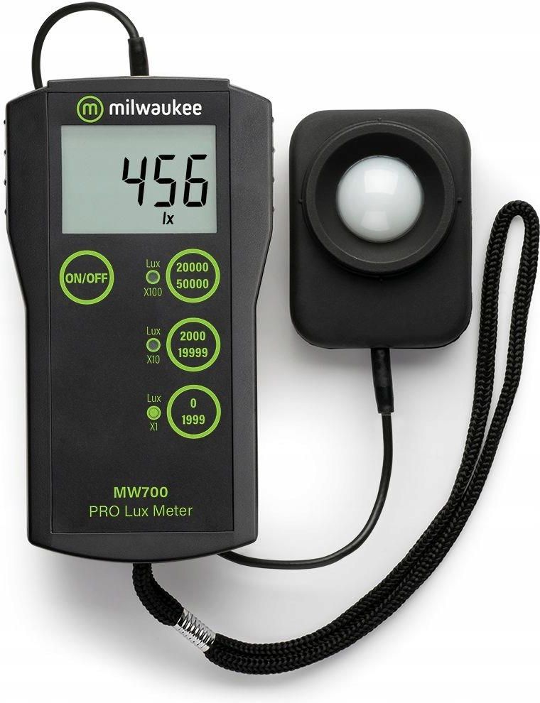 Milwaukee MW700 Luksomierz miernik natężenia światła, miernik 'luksów' Jak wiadomo światło jest niezbędne do uzyskania procesu fotosyntezy, który przekłada się na wzrost i rozwój roślin. W przypadku upraw indoor do doświetlenia asymilacyjnego używamy sztucznego światła w postaci żarówek HPS lub MH. Aby znać dokładną ilość światła w naszym ogrodzie potrzebna jest odpowiednia aparatura jaką jest luksomierz MW 700 firmy Milwaukee. MW 700 jest przenośnym urządzeniem mierzącym natężenie światła. Jest wyposażony w czujnik światła podłączony do licznika w zakresie 0-50000 luxów. Średnio w pomieszczeniach zamkniętych oświetlenie kształtuje się w granicach 100-1000 luxów. Czujnik jest wodoodporny, dzięki czemu możemy sprawdzać natężenie światła również w dolnych częściach zbiornika wodnego. Lux jest jednostką, która wskazuje gęstość światła padającego na powierzchnię. Elektroniczny luxomierz z wodoodporną sondą (do pomiaru natężenia światła m.in. lamp HPS) Specyfikacja: Trzy zakresy pracy: 0.000 to 1999 Lux rozdzielczość 1Lux 2000 to 19999 Lux rozdzielczość 10Lux 20000 to 50000 Lux rozdzielczość 100Lux wbudowany mikroprocesor gwarantuje szybki i dokładny pomiar dokładność: ±6% odczytu długość fali: do 560 nm środowisko pracy: 0 - 50°C / 32 - 122°F, max wilgotność: 95% producent: MILWAUKEE bateria: 1 x 9V (w zestawie) waga: 270 g
