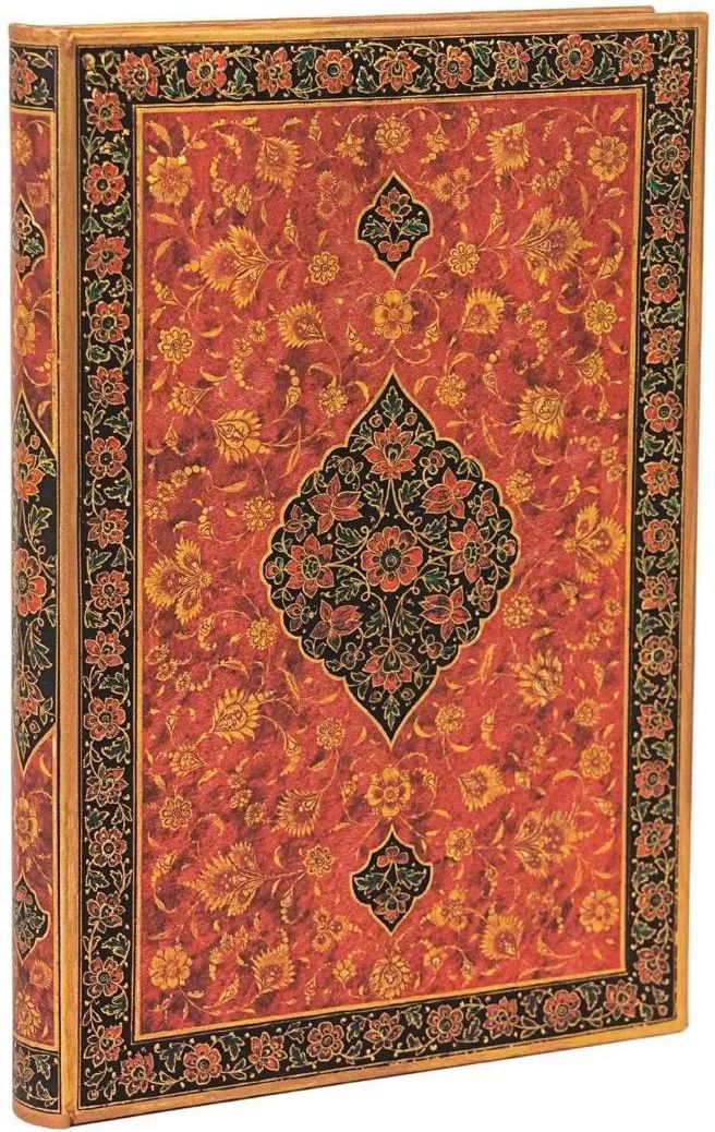 • Elegancki notatnik marki Paperblanks, • Okładka stanowi replikę oryginalnej XVIII-wiecznej oprawy poematu "Khamsa (Pięć Skarbów)" autorstwa perskiego poety Nizamiego • Oprawa twarda • Zadruk: linia • Liczba stron: 144 • Koperta wewnątrz tylnej okładki na wizytówki, drobne notatki i paragony • Satynowa wstążka jako zakładka • Papier ekologiczny z certyfikatem FSC • Gramatura papieru: 120 g/m2 • Notatnik szyty • Wymiary: 18 x 12 cm (format Midi)