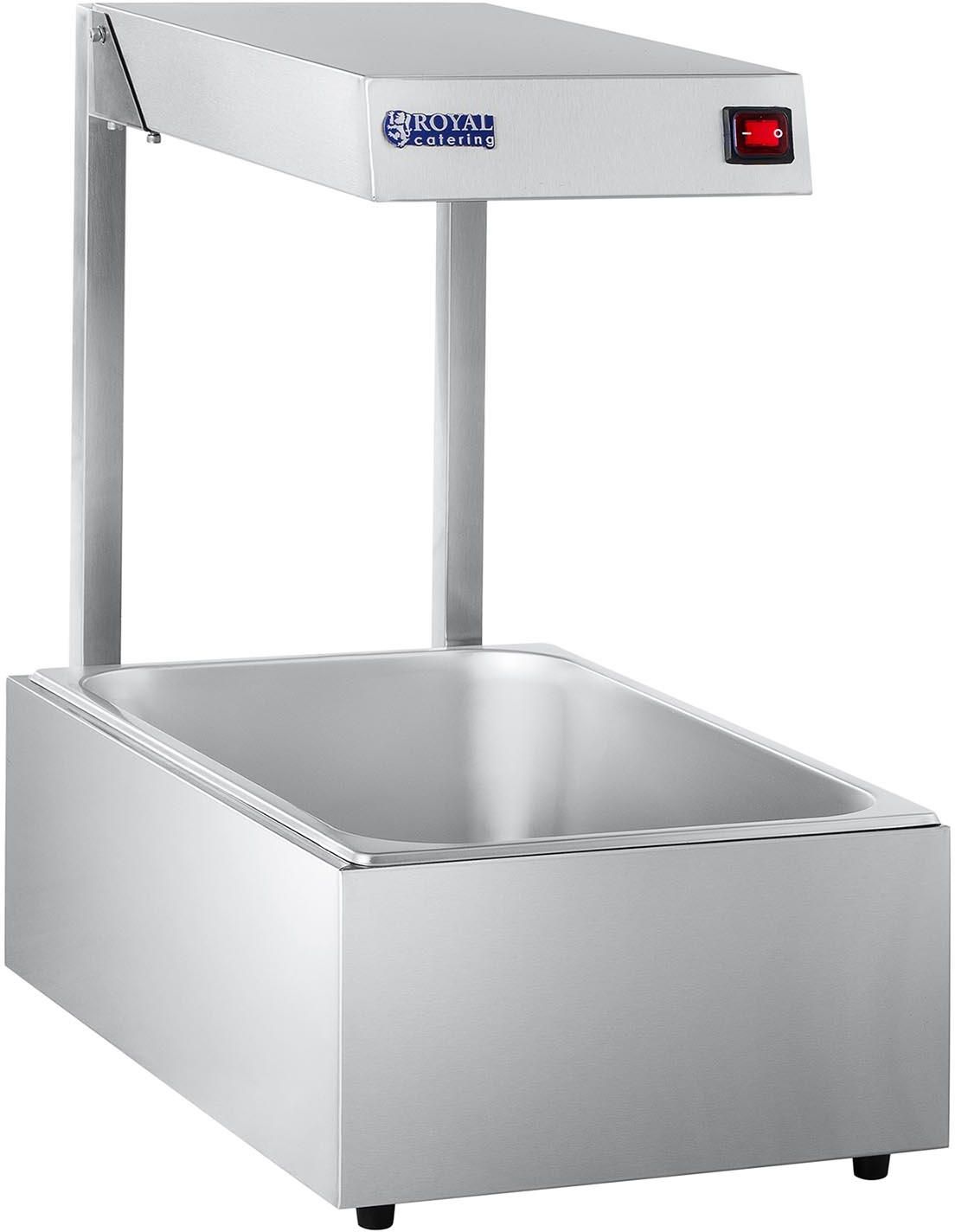 Lampa grzewcza gastronomiczna podgrzewacz do potraw dań 500W + pojemnik GN1 Royal Catering Numer producenta: 10010288 Gastronomiczna lampa grzewcza Royal Catering o mocy 500W umożliwi skuteczne podgrzanie potraw do temperatury 80°C, a także atrakcyjne zaprezentowanie dań. Urządzenie wyposażono w pojemne naczynie GN1/1 (gł. 150 mm, poj. 19 l), które pozwoli na utrzymanie temperatury dużej ilości jedzenia. Podgrzewacz oraz pojemnik GN1/1 zostały wykonane ze stali nierdzewnej, odpornej na korozje oraz uszkodzenia mechaniczne. Dodatkowo nie wchodzi ona w reakcje z żywnością, dzięki czemu nie stanowi zagrożenia dla zdrowia. Wykorzystanie stali ułatwia czyszczenie urządzenia, a pojemnik można myć w zmywarce. Lekka konstrukcja oraz 1,4-metrowy przewód pozwolą na swobodne przenoszenie lampy grzewczej w zależności od potrzeb. Zamontowane cztery gumowe nóżki gwarantują stabilność i chronią powierzchnię, na której stoi podgrzewacz przed porysowaniem. Cechy produktu: - Efektywność - lampa halogenowa o mocy 500W zapewniająca podgrzanie oraz atrakcyjną prezentację dań, - Wytrzymałość - konstrukcja ze stali nierdzewnej, - Mobilność - niewielka waga i długi przewód zasilania, - Stabilność - gumowe nóżki zapobiegające ślizganiu się Parametry techniczne: - Model - RCWB-500 - Nr katalogowy - 10010288 - Stan artykułu - Nowy - Materiał - Stal Nierdzewna - Moc - 500 W - Napięcie - 230 V / 50 Hz - Wymiary pojemnika na żywność - 530 x 325 x 150 mm - Rodzaj pojemnika - GN 1/1 - Pojemność - 19 l - Przewód zasilania - 1,4 m - Żarówka - Lampa halogenowa J118 - Wymiary (DxSxW) - 56,9 x 33,7 x 58,5 cm - Waga - 7,7 kg - Wymiary wysyłki (DxSxW) - 60 x 40 x 26 cm - Waga wysyłki - 8,5 kg W zestawie: - Podgrzewacz do potraw - Pojemnik GN1/1 wys. 150 mm - Tacka ociekowa - Akcesoria montażowe - Instrukcję PL Kod producenta: 1008927 Gwarancja: 2 lata