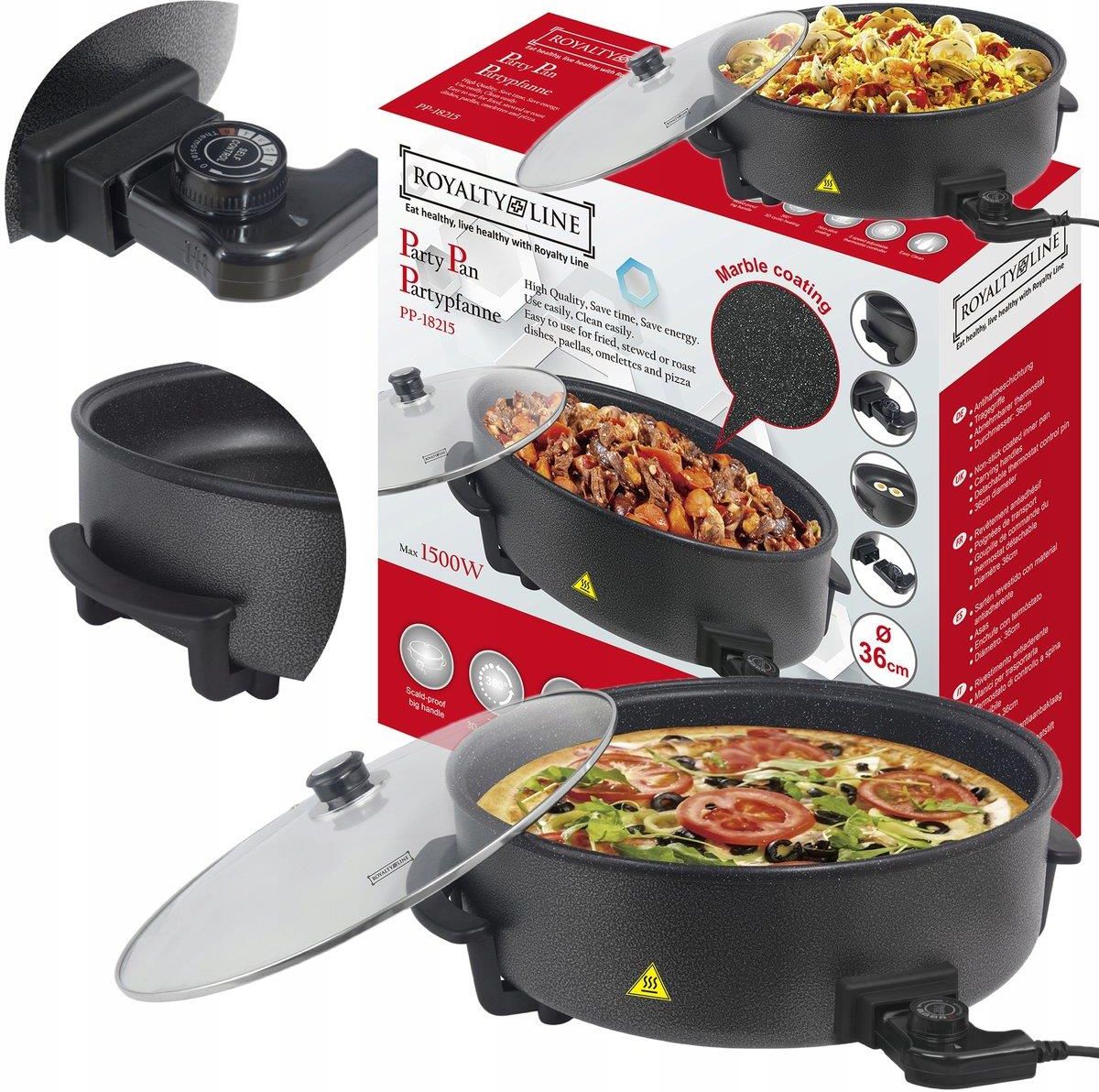 PATELNIA ELEKTRYCZNA NAJWIĘKSZA PIZZA 42cm XXL 1500W NIEPRZYWIERA NON-STICK CO WYRÓŻNIA NASZ PRODUKT 1✔️Automatyczna regulacja temperatury z 5 programami temperaturowymi. Szklana pokrywka z otworem do odprowadzania pary i nieprzywierająca powłoka. Solidna konstrukcja z wysokimi ściankami, ergonomicznymi uchwytami i antypoślizgowymi nóżkami. Uniwersalne zastosowanie do pieczenia różnorodnych potraw. DOSKONAŁA JAKOŚĆ PIECZENIA! Patelnia elektryczna Royalty Line o średnicy 42 cm to wysokiej jakości produkt, który zapewni Ci doskonałe rezultaty pieczenia. Dzięki mocy 1500W szybko osiąga pożądaną temperaturę, a funkcja automatycznej regulacji temperatury utrzymuje ją na stałym poziomie, gwarantując idealne wypieki. WYJĄTKOWA FUNKCJONALNOŚĆ! Patelnia wyposażona jest w 5 programów temperaturowych, umożliwiających przygotowanie różnorodnych potraw, od pizzy po naleśniki i jajecznicę. Szklana pokrywka z otworem do odprowadzania pary pozwala na kontrolowanie procesu pieczenia, a nieprzywierająca powłoka ułatwia wyjmowanie potraw. PRAKTYCZNA I WYTRZYMAŁA KONSTRUKCJA! Patelnia charakteryzuje się solidną budową, z wysokimi ściankami ułatwiającymi przygotowanie różnych rodzajów potraw. Ergonomiczne uchwyty zapewniają wygodne przenoszenie, a antypoślizgowe nóżki gwarantują stabilność na blacie. Dodatkowo, możliwość odłączenia przewodu zasilającego ułatwia konserwację. UNIWERSALNE ZASTOSOWANIE! To niezwykle wszechstronne urządzenie, które sprawdzi się nie tylko do pieczenia pizzy, ale również do przygotowywania burgerów, szynki, boczku, naleśników i wielu innych potraw. Stanie się nieodzownym elementem Twojej kuchni, dostarczając smacznych i chrupiących przysmaków. SPECYFIKACJA Stan: Nowy Marka: Royalty Line Kolor dominujący: czarny Model: RL-PP18214 Moc: 1500 W Pojemność: 5 l Funkcje urządzenia: regulacja temperatury Funkcje gotowania: podgrzewanie Komunikacja: termostat Bezpieczeństwo: zabezpieczenie przed przegrzaniem Kod producenta: RL-PP18214 Stan opakowania: oryginalne