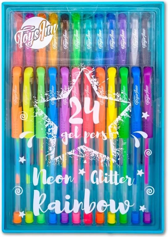 Długopisy żelowe 24 sztuki Zestaw długopisów żelowych 24 szt. składa się z trzech rodzajów żelówek: neon (6 szt.), glitter (12 szt., z metalicznymi drobinkami) oraz rainbow (6 szt., tusz długopisu jest wielokolorowy). Kolory długopisów neon: różowy, pomarańczowy, żółty, zielony, niebieski i …